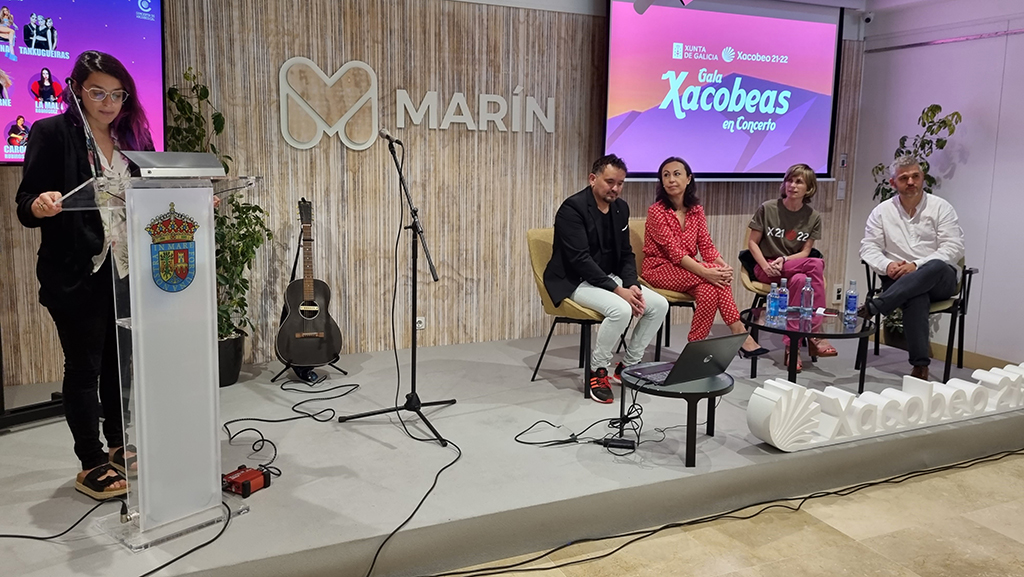 La Gala Xacobea estuvo presentada ayer en el Museo Torres por la Directora de Turismo de Galicia, Nava Castro y la alcaldesa de Marín María Ramallo a quienes acompañaban los representantes de la empresa productora y una de las cantantes que participará en el concierto, la grovense Carolina Rubirosa, quien interpretó un par de temas para ambientar el acto recibiendo los merecidos aplausos de los asistentes