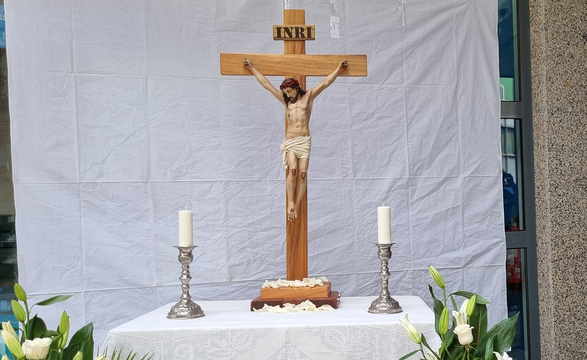 A lo largo del recorrido, como es tradicional, se colocan algunos altares en los que la procesión realiza sendas paradas para impartir la bendición con el Santísimo. Una de ellas se pone en la calle Jaime Janer, esquina a Concepción Arenal, frente a las oficinas de Abanca y allí se instaló un hermoso crucifijo con una imagen de Cristo, verdadera obra de arte.