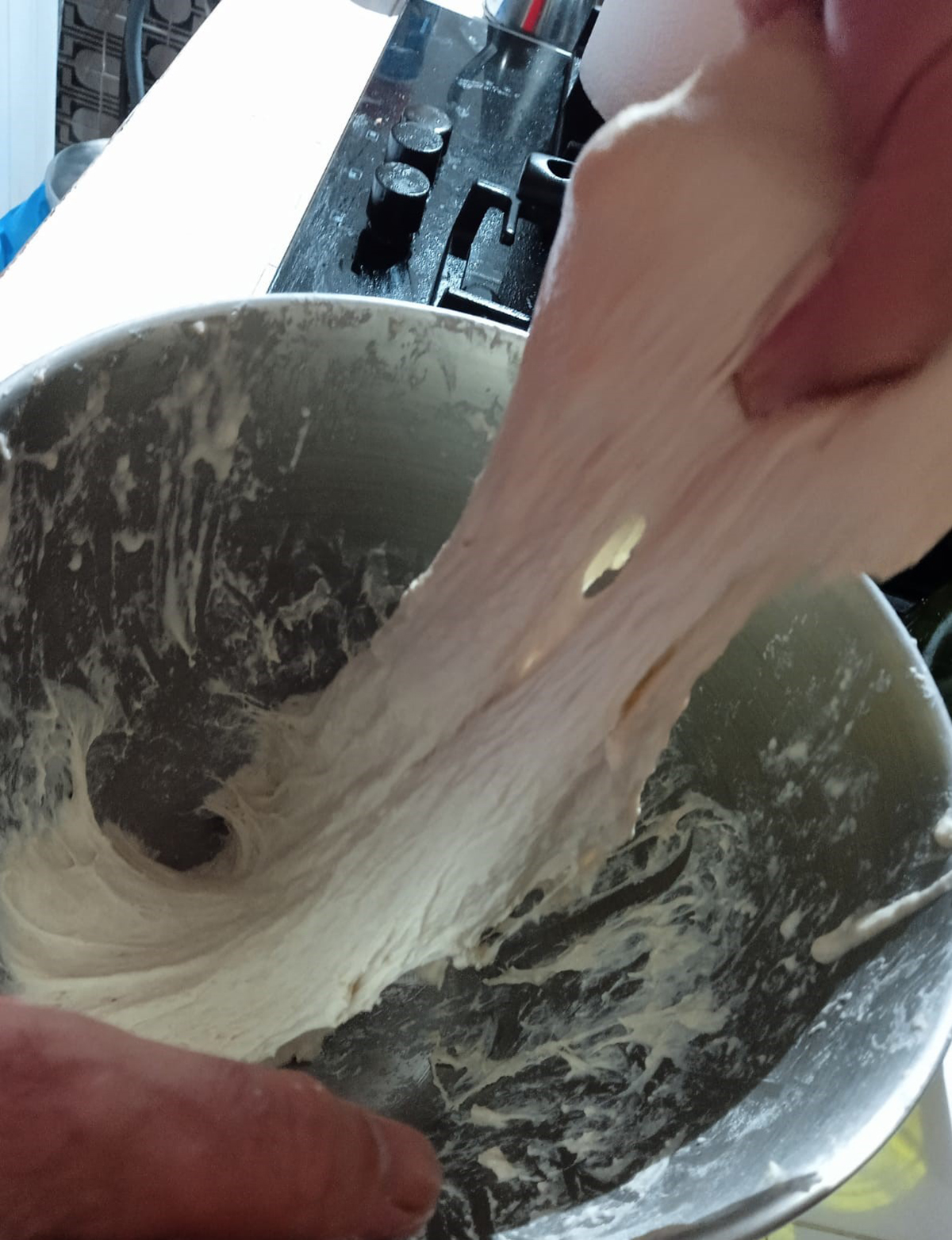 23:15 horas. Con un poco de harina en la mano, nos ayudamos para dar el último amasado, con movimientos envolventes con la mano abierta y apretando con el puño cerrado. Cinco minutos.