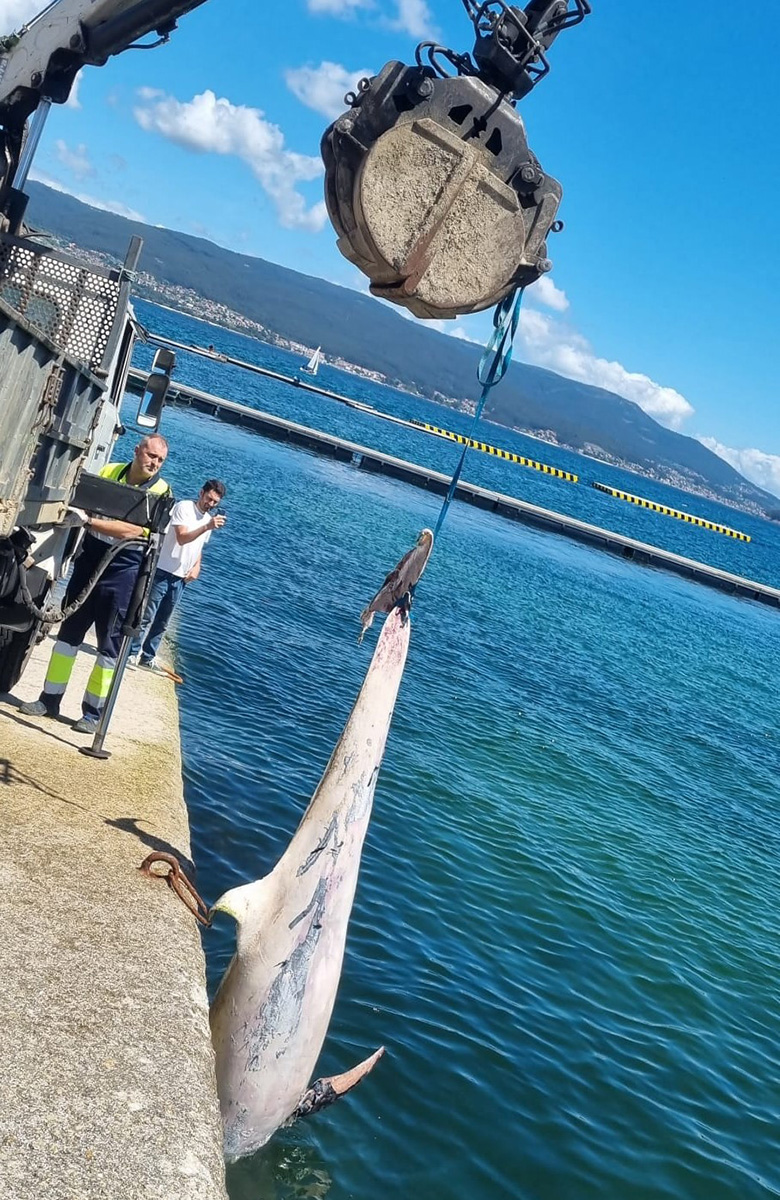 Operarios municipales izaron el cadáver el cetáceo en el Puerto de Aguete