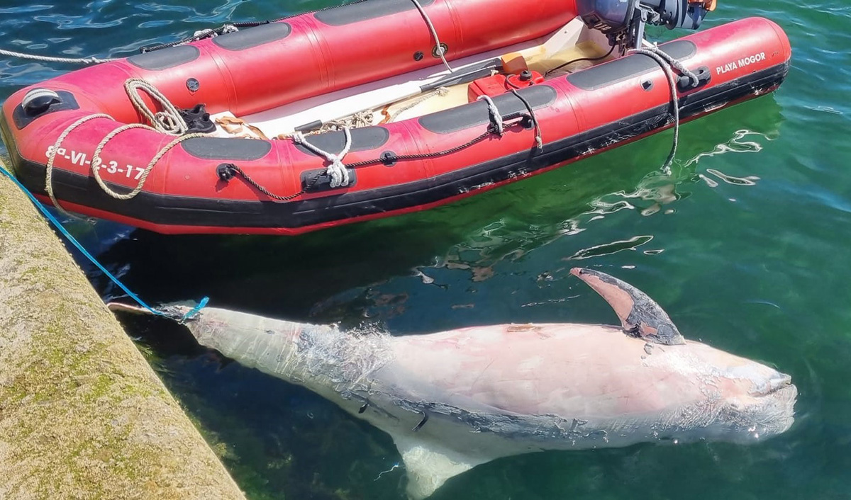 Hacia la una de la tarde de este lunes apareció flotando en las rocas entre las Playas de Portocelo y Mogor el cadáver de un calderón común de unos 300 kilogramos de peso. Fue localizado por un vecino que dio aviso a los servicios de emergencia, quienes a su vez contactaron con la agrupación Local de Protección Civil, que se hizo cargo del asunto trasladando una neumática al lugar del hallazgo y remolcando el cuerpo desde su ubicación hasta el Puerto de Aguete.