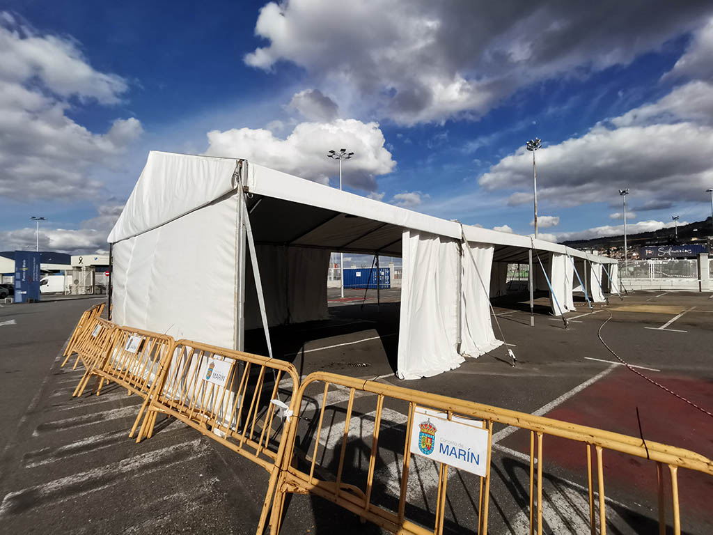 Esta mañana se iniciaron los trabajos de preparación de la zona donde, a partir de mañana martes, se llevará a cabo el cribado por muestras de saliva en el que potencialmente se aprovecharán 13.796 personas. Desinfectado de la superficie y montaje de carpas en las cercanías de la parada de los autobuses además de la señalización que deberán seguir los participantes, dará paso mañana a partir de las diez y hasta las siete y media de la tarde a la entrega de los tubos a los 2.826 ciudadanos convocados para ese primer día en el que no habrá recogida de la muestra.