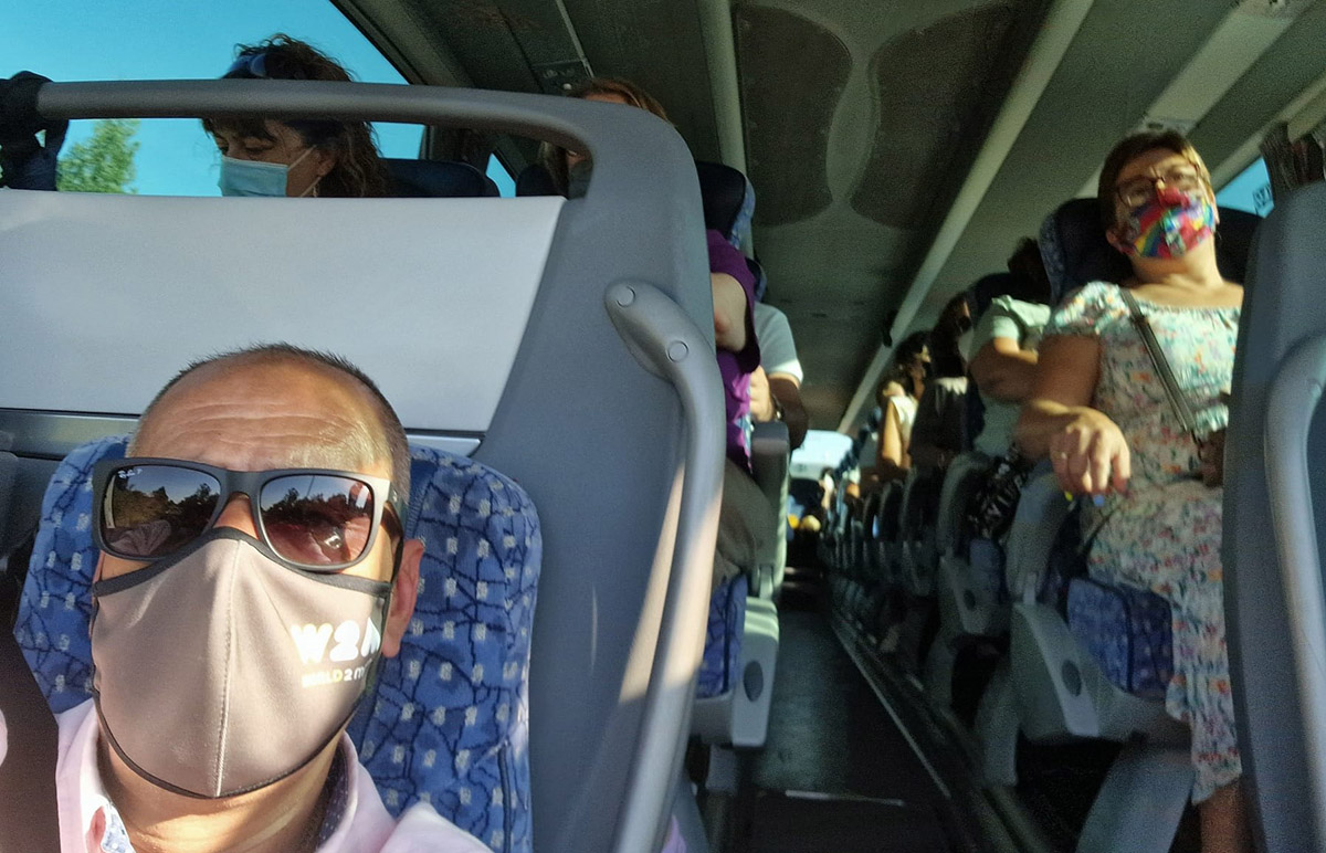 Raimundo Calviño como guía de una de sus excursiones en el interior del autobús