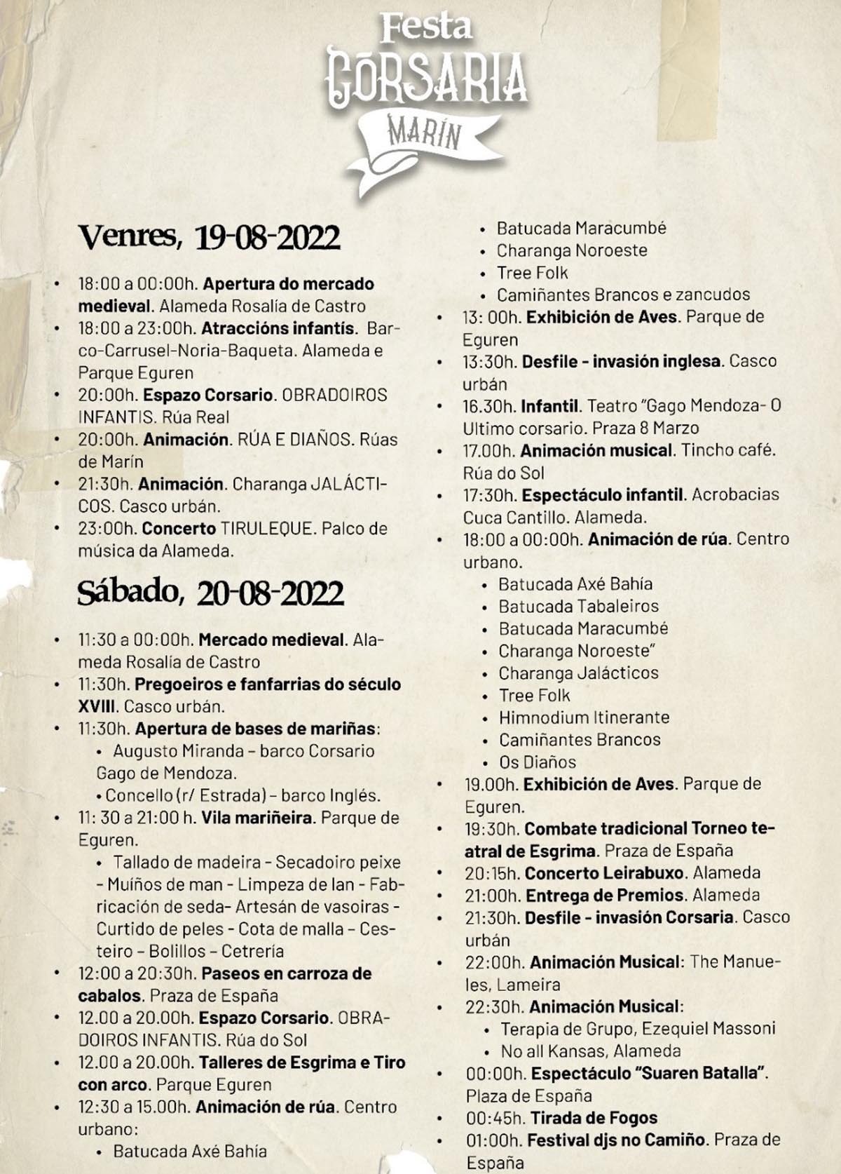 La previsión meteorológica de cara a los días viernes y sábado es inmejorable para la celebración de la “Fiesta Corsaria” que animará una vez más, las calles de Marín con multitud de actos de carácter folclórico, musical e histórico considerando el contenido “corsario” próximo a la realidad histórica de Marín.