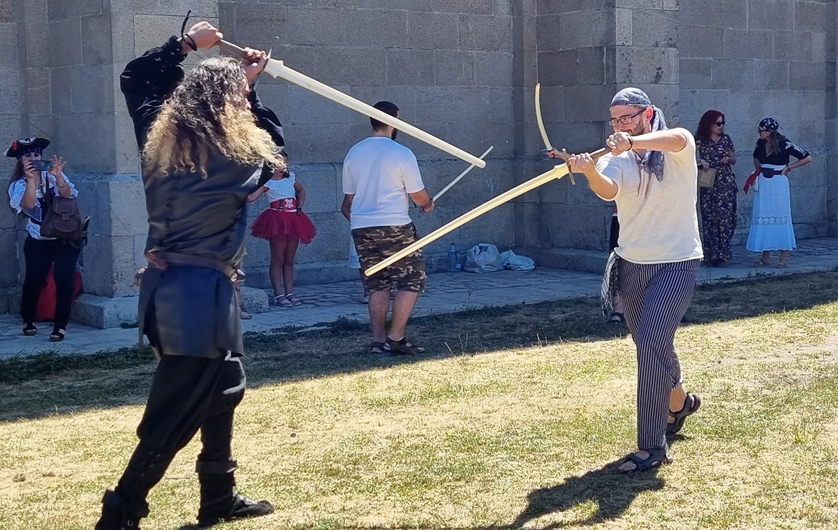 Luchas entre corsarios con espadas en el atrio parroquial y Parque Eguren