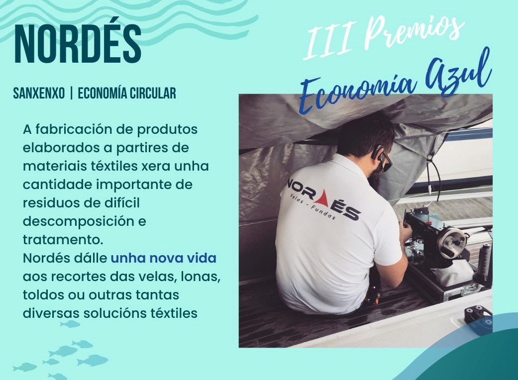 Por último, na categoría de economía circular, a candidata é a iniciativa de Nordés Velería, que consiste na creación de novos produtos a partir de materiais reutilizados e residuos da fabricación de velas, lonas e toldos. O proxecto permite mellorar asustentabilidade do negocio ao tempo que se reduce o impacto medioambiental.