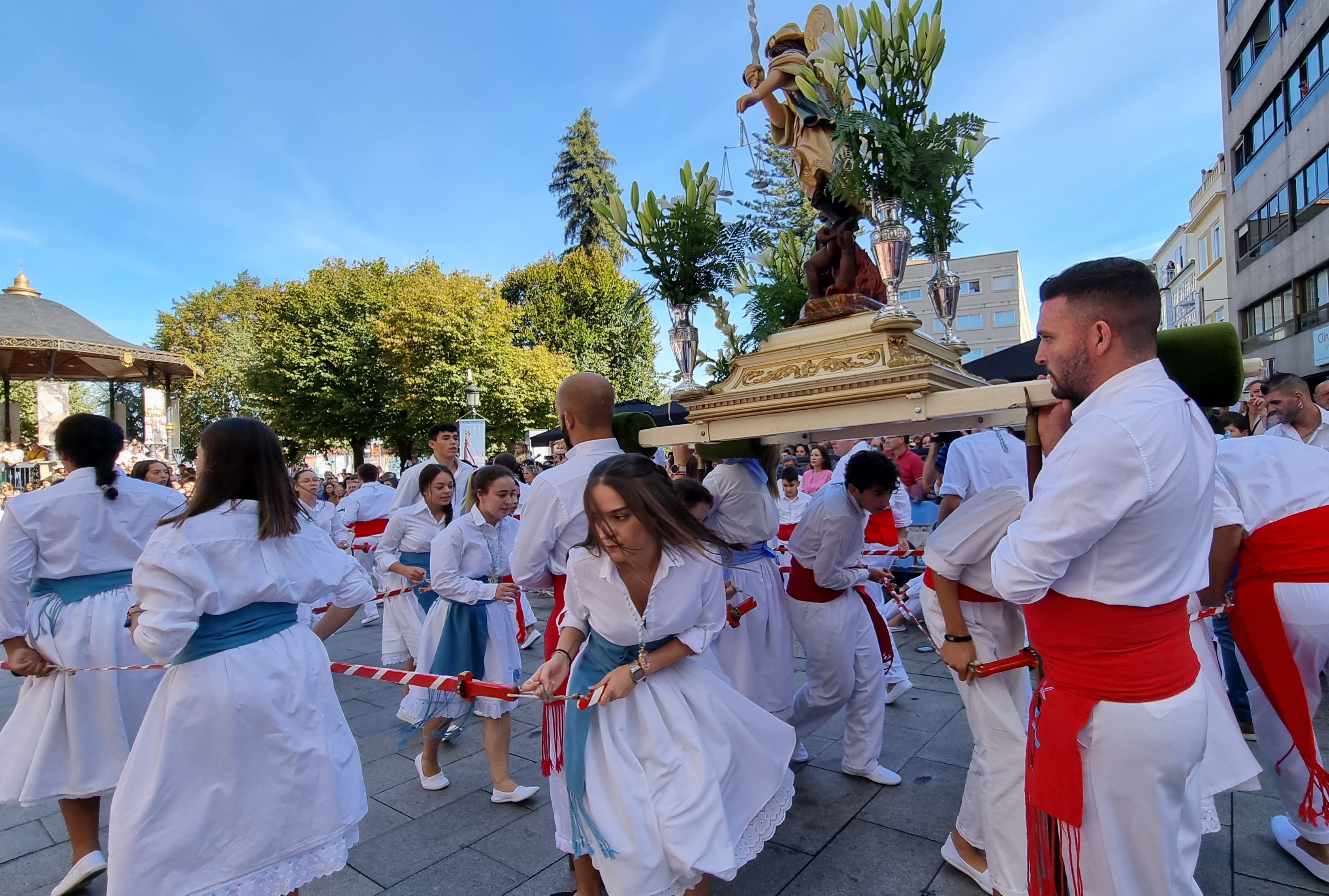 Y es que la Danza de Espadas de Marín tiene un origen y una motivación que no es otra que la de honrar a San Miguel, Patrón de los Mareantes, marineros que rendían su homenaje al Arcángel especialmente en la festividad de septiembre o, me imagino que cuando tuvieran ocasión para ello. Y en las evoluciones de la Danza de Espadas de Marín no se puede, mejor dicho, no se debe, obviar esa motivación porque tanto cuando la bailaban solamente los mareantes, como ahora que lo hace la juventud masculina y femenina que la conserva, la Danza de Espadas de Marin realiza su baile ante la imagen de San Miguel bajo cuya anda pasan las filas de danzantes varias veces durante la interpretación y, en un momento de la misma, realizan la figura de la estrella rodeando el Pendón que tiene siglos de antigüedad, tras realizar el rodeo que en el vídeo se ve una y otra vez en forma de caracol incompleto. Entiendo que, aunque fuera como valor testimonial, se pudo utilizar el mencionado Pendón que, además, tiene una imagen en miniatura de San Miguel en su cúspide, lo que sería un indicativo suficiente del “corazón” de la Danza.