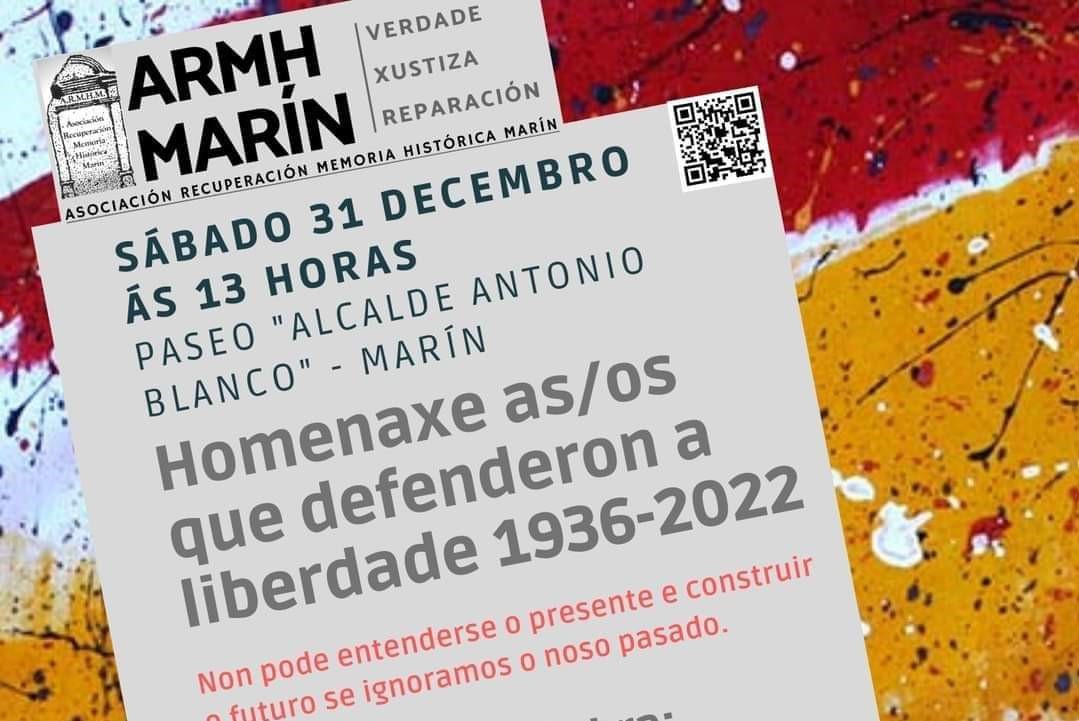O vindeiro sábado día 31 de decembro, ás 13:00 h., terá lugar o acto anual de lembranza e homenaxe no Paseo Alcalde Antonio Blanco organizado pola "Asociación para a Recuperación da Memoria Histórica de Marín".