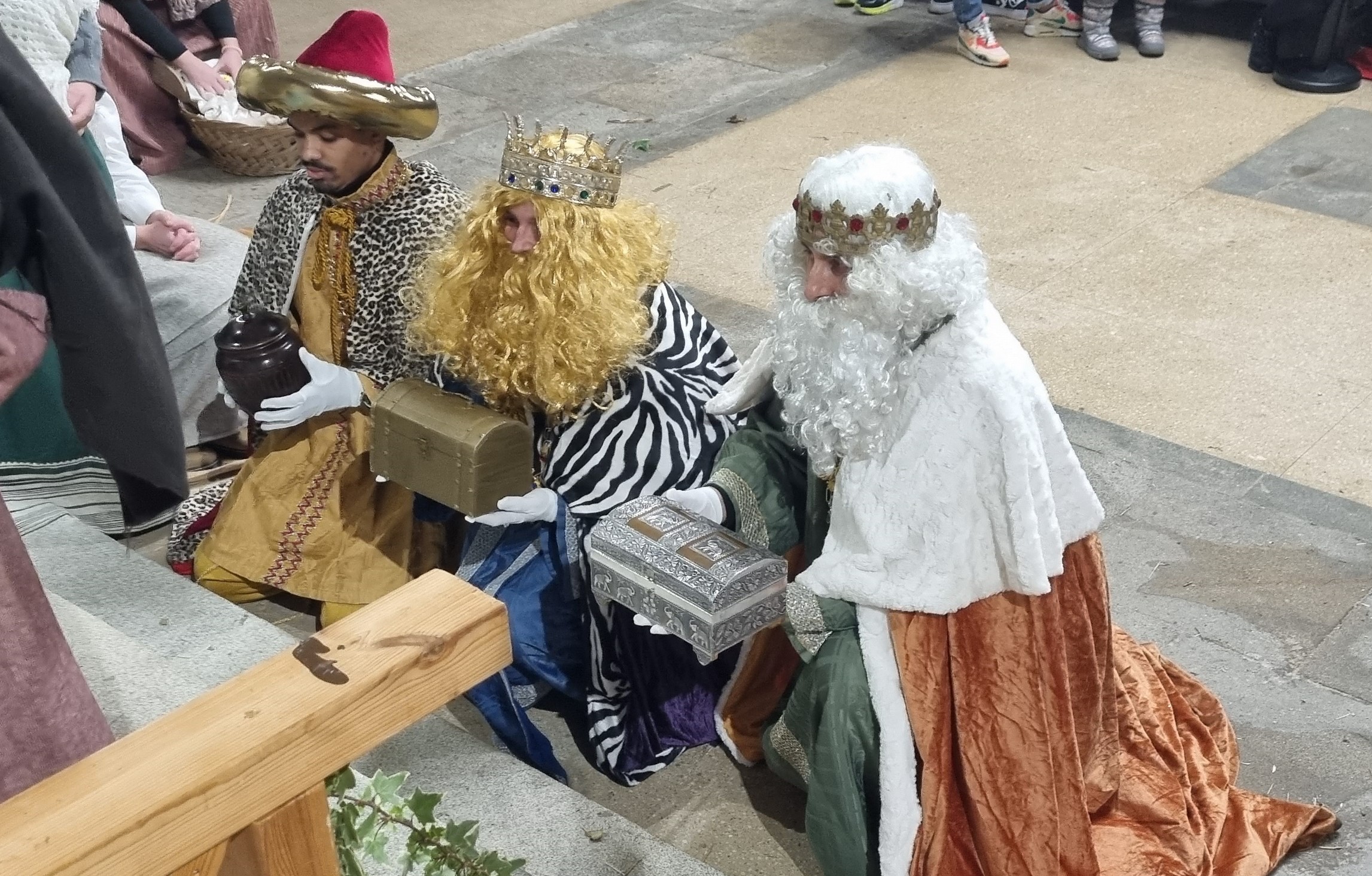 La Cabalgata finalizó en el Nuevo Templo donde, este año, se procedió al simbólico momento de la Adoración de los Magos al Niño Jesús que se encontraba en su cuna escoltado por San José y María que no era sino Sabela, una joven madre que siendo ella bebé también representó al Niño Jesús.