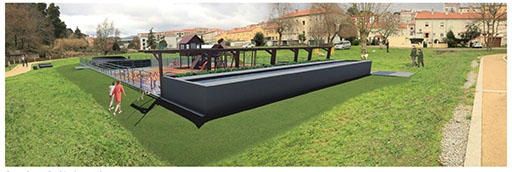 El parque contará, además, con una zona ajardinada que servirá como cierre de la instalación con mobiliario urbano, bancos y una pérgola de madera para crear sombra además de una fuente que recorrerá el parque con agua canalizada desde el propio río con una serie de surtidores verticales de carácter ornamental a lo largo de todo el canal.