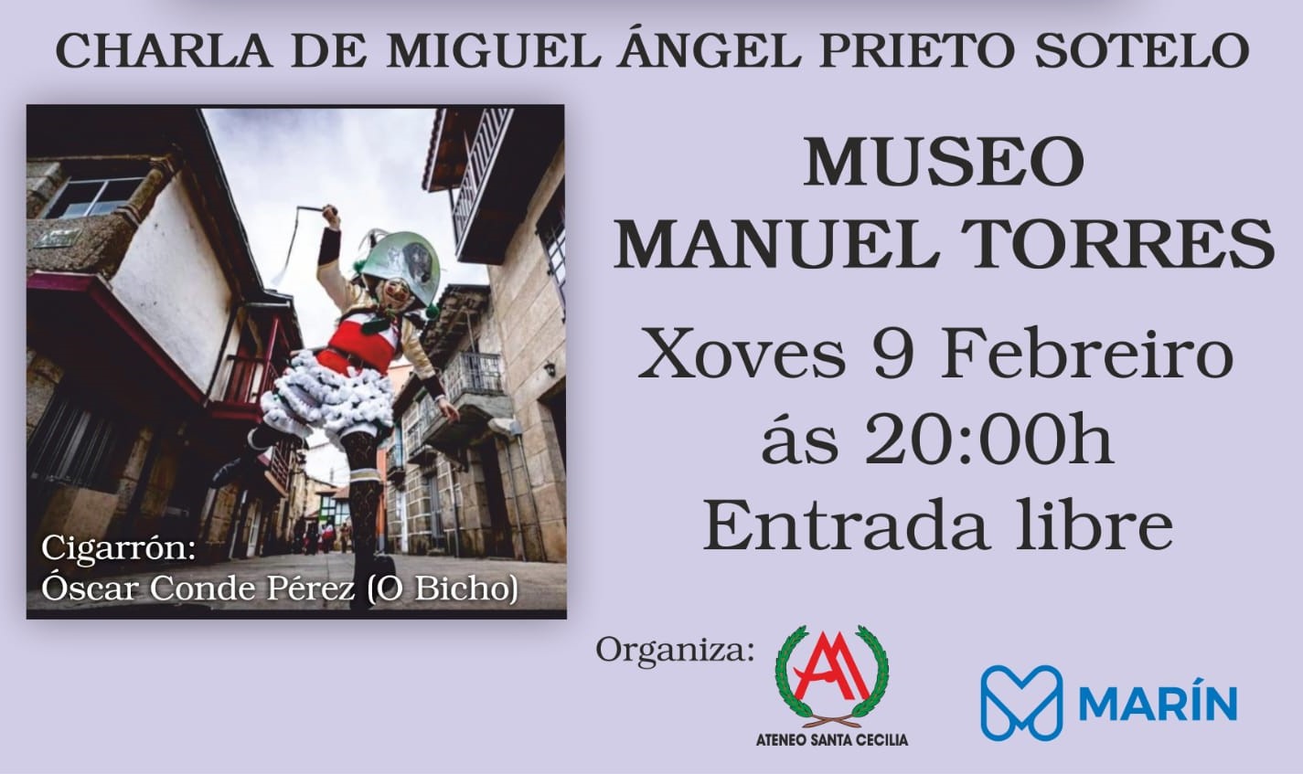 Y el acto consistirá en una conferencia que, con el titulo “O Entroido, o meu sentimento” pronunciará Miguel Ángel Prieto en el Museo Torres a partir de las ocho de la tarde con entrada libre y con la certeza de que los asistentes vivirán las experiencias de un conferenciante muy apegado a la cultura y la tradición de su pueblo, además de ser un personaje de verdadera acción en lo que al Entroido se refiere, autor de libros que recogen historias apegadas a la vida misma y conocedor de las tradiciones gallegas y en especial al Entroido del que fue pregonero, nada menos que en Verín, uno de los centros neuurálgicos del carnaval de nuestro país, en el año 2020.