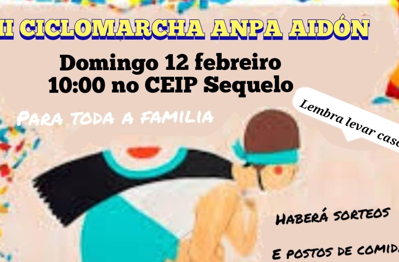 La Asociación de madres y padres del colegio Sequelo organiza para la jornada de hoy la “II Ciclomarcha ANPA Aidón” con invitación a todas las personas que deseen participar ya que se harán dos recorridos para adaptarlos, precisamente a las posibilidades de los asistentes. El circuito “A” llevará a los ciclistas desde el Sequelo hasta Mogor y la Avenida de Ourense mientras que el gruo “B” saldrá del Sequelo y retornará una vez alcanzado el Centtro de Salud con lo que evitará el peligro de la carretera y la circulación de vehículos.
