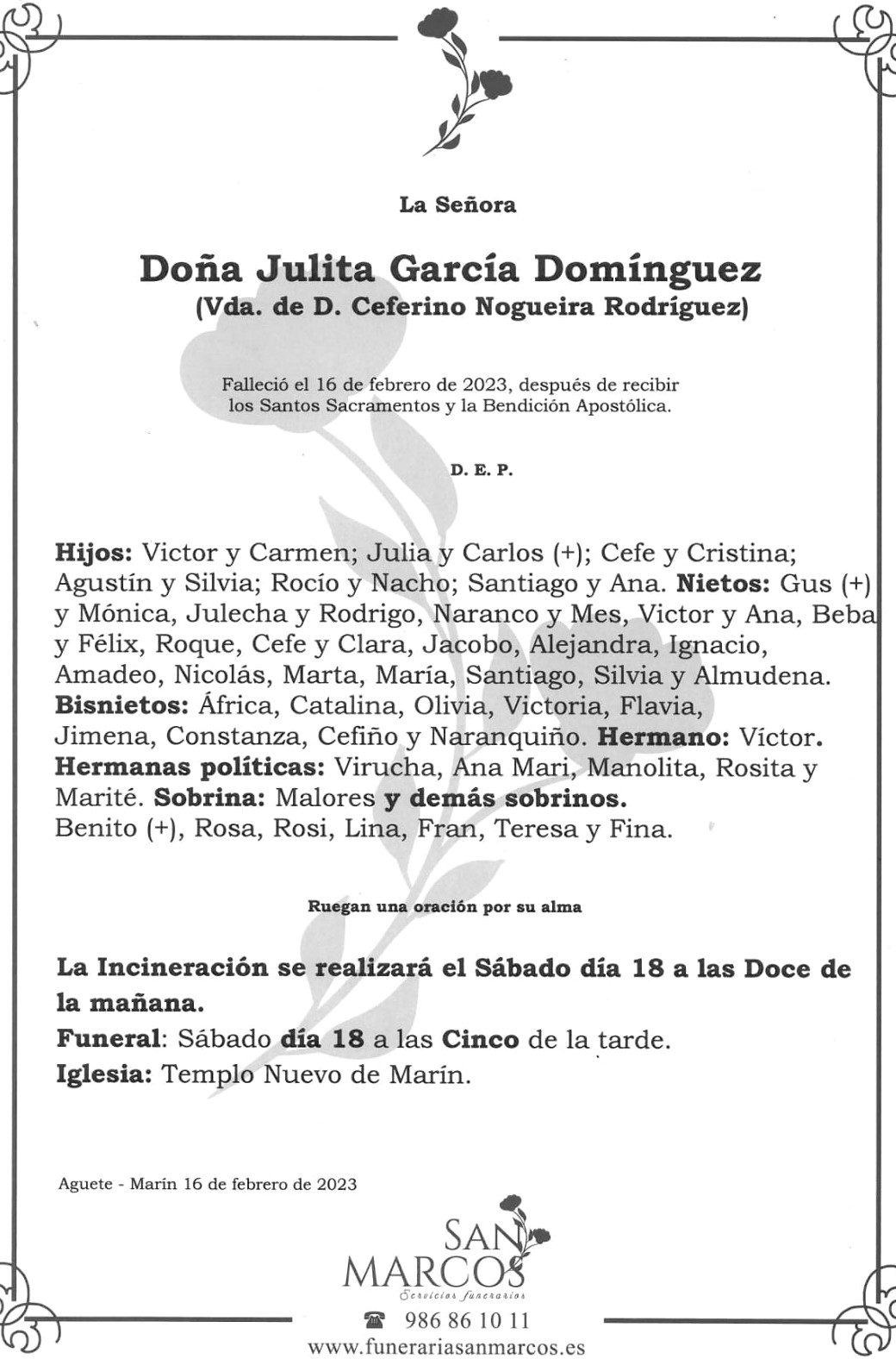 Según últimas noticias que nos llegan de fuentes próximas a la familia,, los restos mortales de Doña Julia que se velan en su propio domicilio, serán incinerados el sábado a las doce horas en tanto que el funeral por su eterno descanso será el mismo día pero a las cinco de la tarde en el Nuevo Templo de Marín