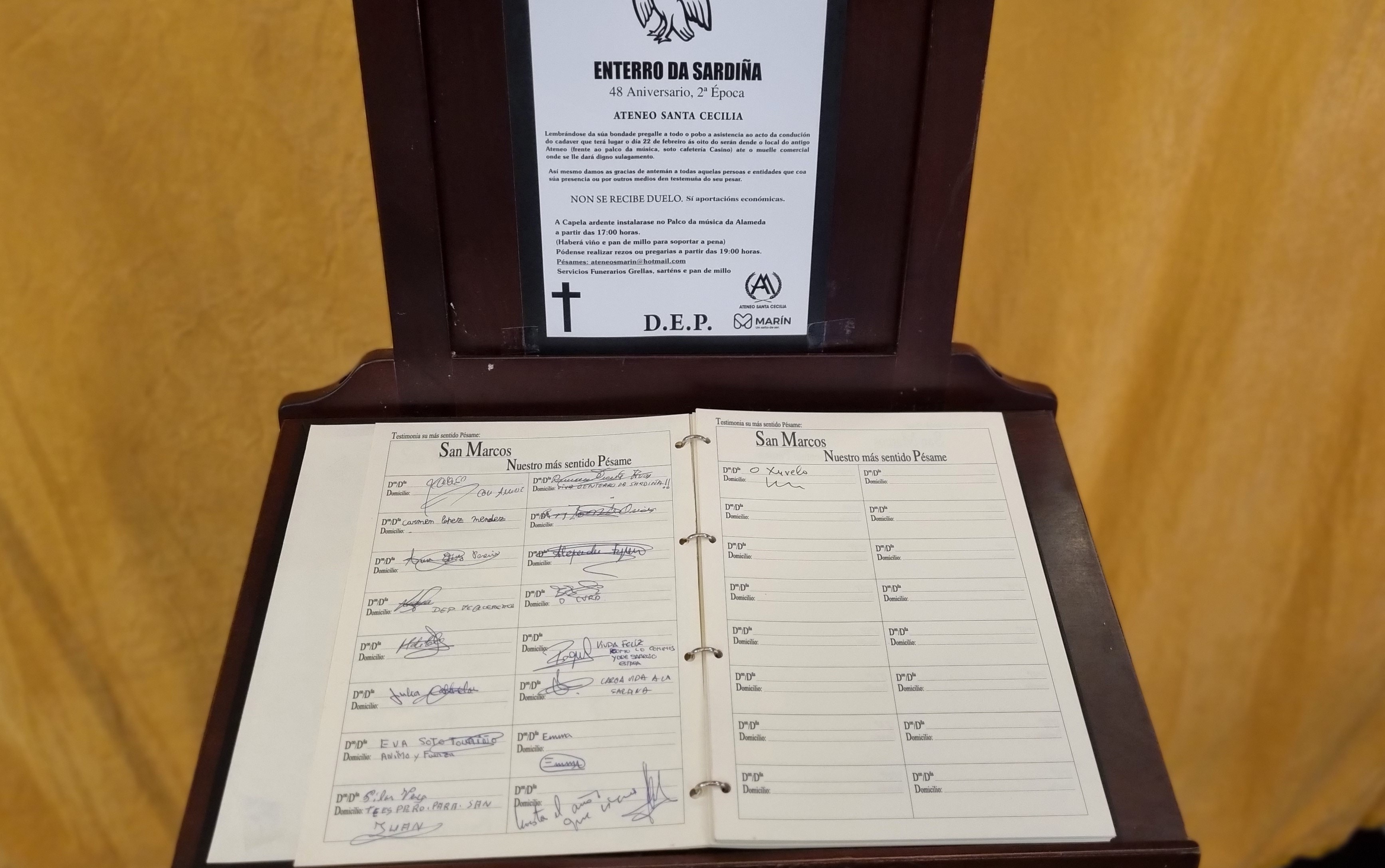 La planta baja del Concello de Marín se ha convertido en la sala de velatorio de un tanatorio donde se puede expresar el pesar y duelo por la muerte de la “Sardiña” que recibirá mañana os honores fúnebres de su solemne “entierro” que aunque se denomine así no es tal porque la sardina no va a tierra sino que acaba en el mar de donde salió en su día “de fiesta”.