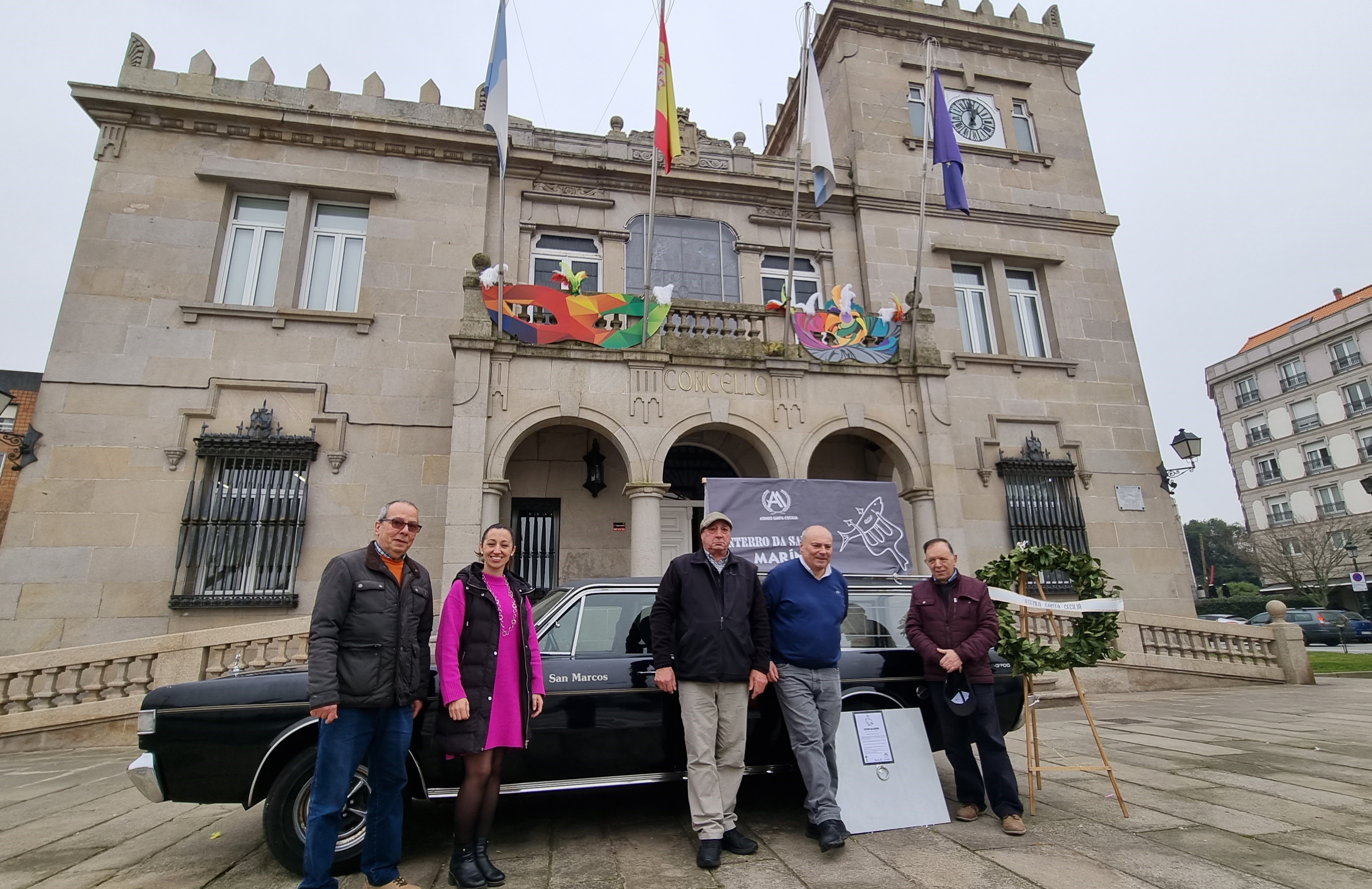 Los organizadores con el coche fúnebre que se encuentra delante del concello