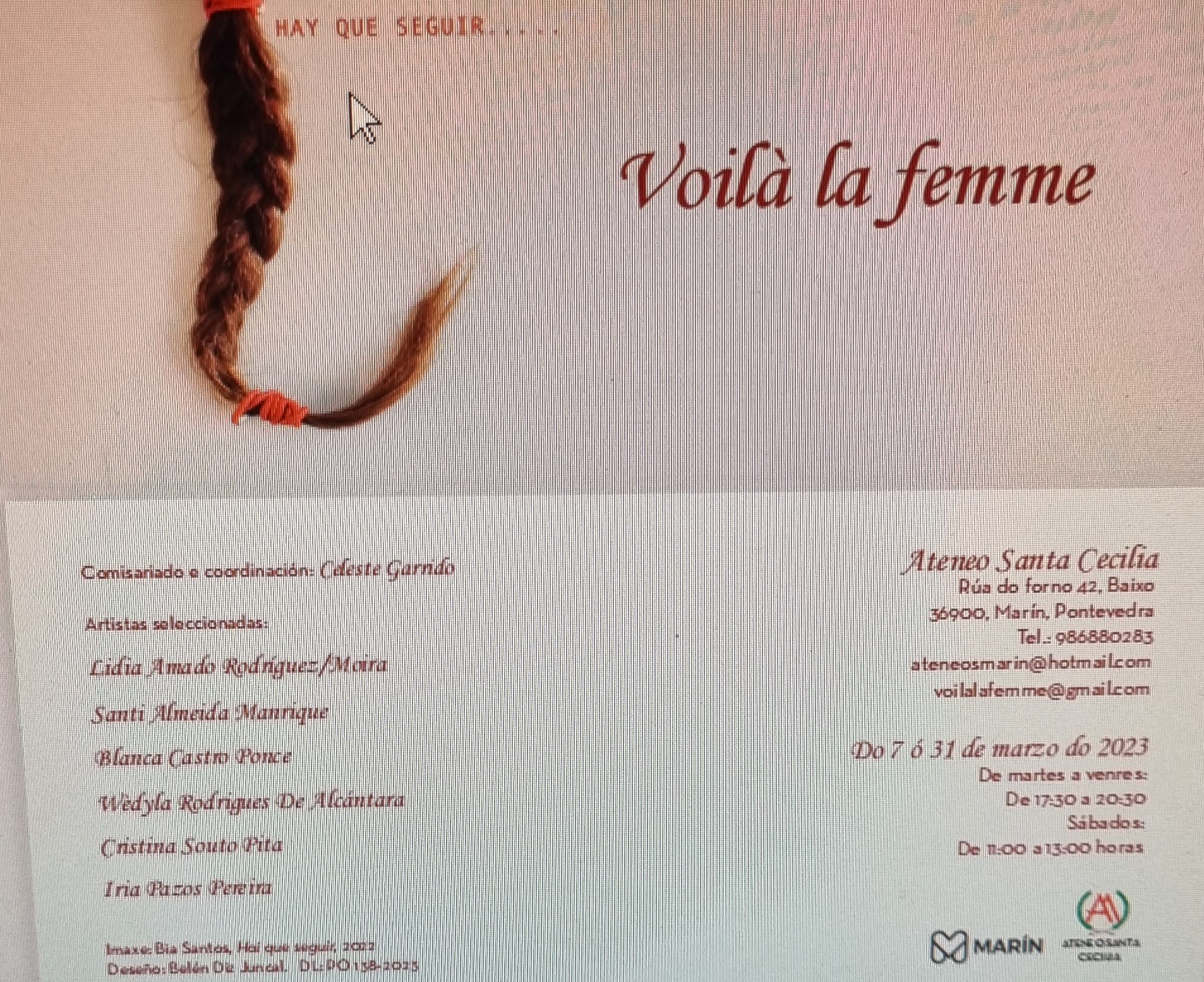 Este martes día 7 de marzo ás 20:00 h. será inaugurada a XXX edición da exposición Voilá la femme comisariada e coordinada por Celeste Garrido, no Ateneo Santa Cecilia de Marín, Rúa do Forno nº 42 - baixo, mostra que permanecerá aberta ate o 31 de marzo e conta coa participación das artistas seleccionadas: