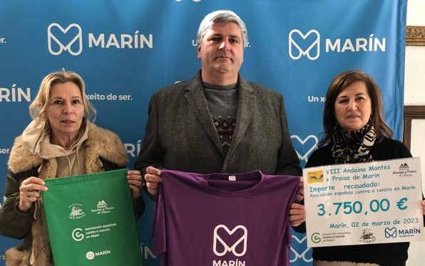 “Montes e Praias de Marín”, era el nombre genérico de la marcha y setecientas cincuenta personas inscritas, porque hubo limitación de admisión una vez llegado a ese número de participantes, y el resultado fue la recaudación de tres mil setecientos euros que ayer fueron entregados a la presidenta local de la AECC, Miluca Rey Parada al alimón por el representante del club Xesteiras, José Gil y la concejala de Turismo Cristina Acuña mediante un cheque con la donación conseguida.