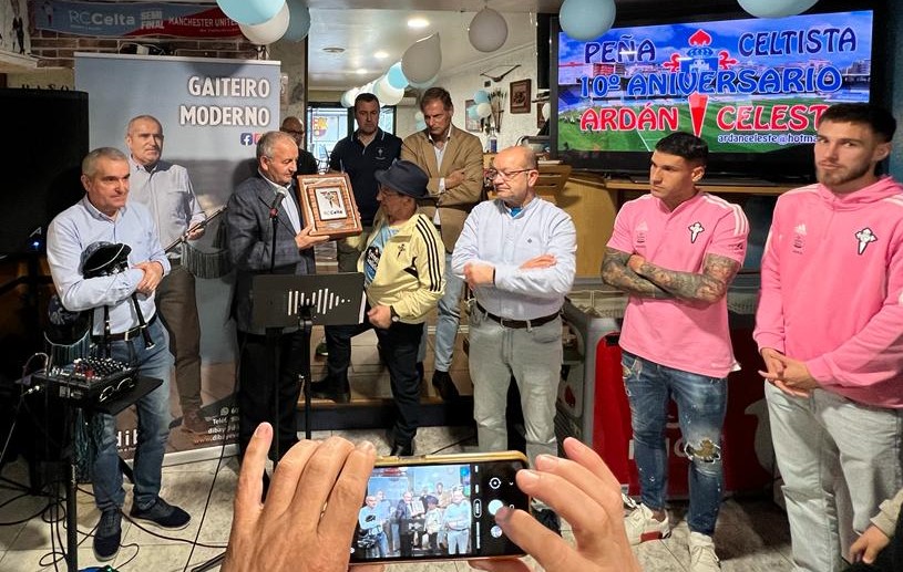 La peña celtista Ardán Celeste celebró el pasado martes su décimo aniversario en el Bar Garfil de Ardán. Los miembros de la peña celebraron con Hugo Mallo y Óscar Mingueza la buena marcha que lleva el equipo que ha conseguido tres victorias y dos empates en las cinco últimas jornadas disputadas y está situado en la décima plaza de la clasificación en la Liga BBVA de Primera División.