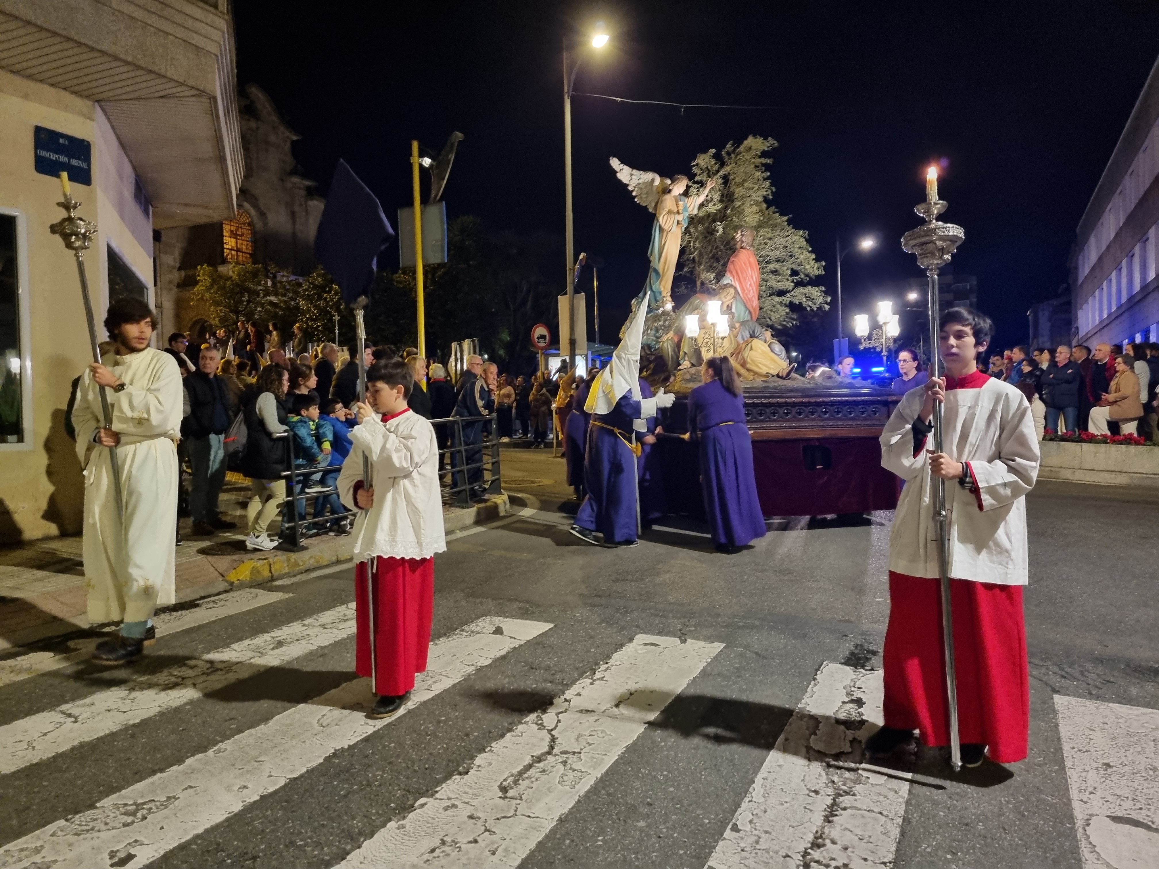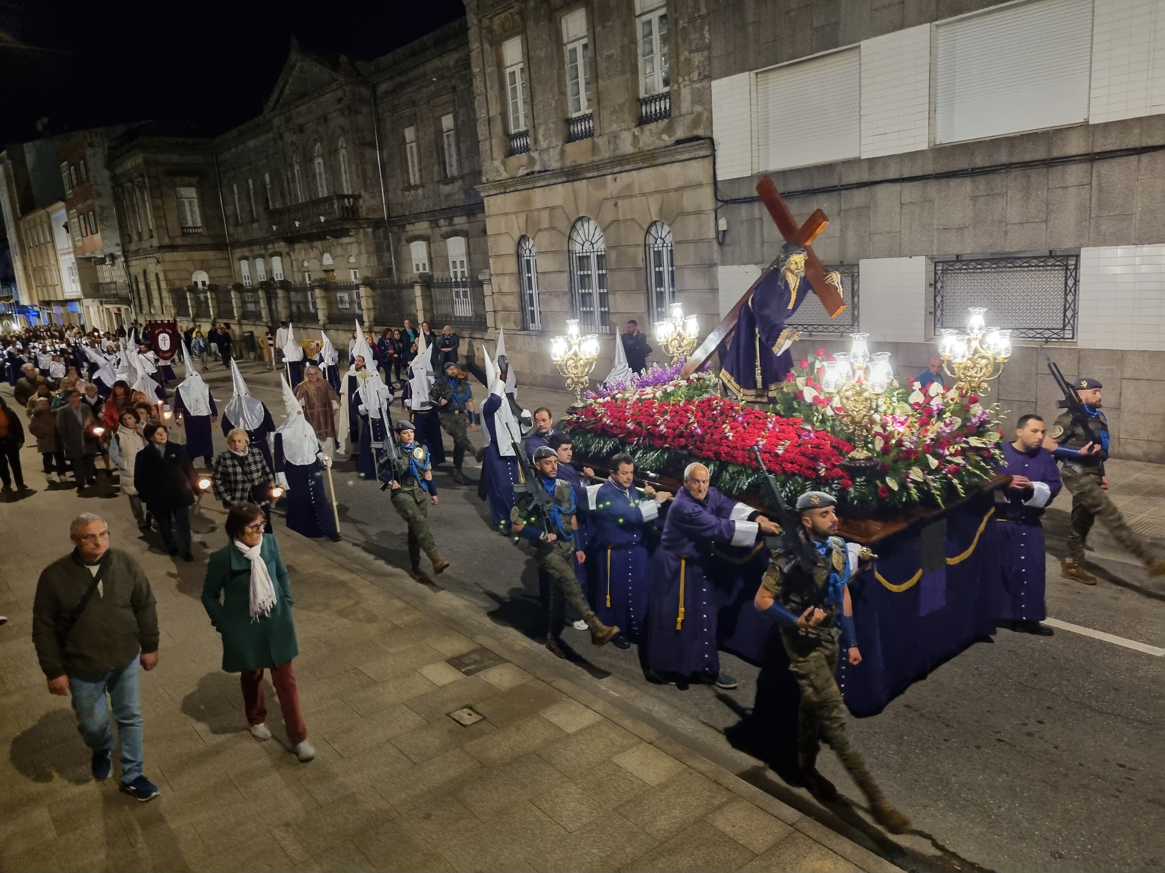 La procesión del Santo Encuentro que salió la pasada medianoche fue seguida activa y pasivamente por cientos de personas que, como es tradicional, participaron en ambas comitivas o presenciando desde las aceras su paso y, especialmente en la Plaza de España donde, como es tradicional, fue el punto de encuentro entre las imágenes del Nazareno y de la Virgen de los Dolores, momento especialmente emotivo en el que se guarda un respetuoso silencio antes de que, por un lado la Banda de Tambores cornetas y gaitas del Nazareno y, por otro, la Banda de Música de la Escuela Naval Militar, interpreten sendas piezas adecuadas al acto.