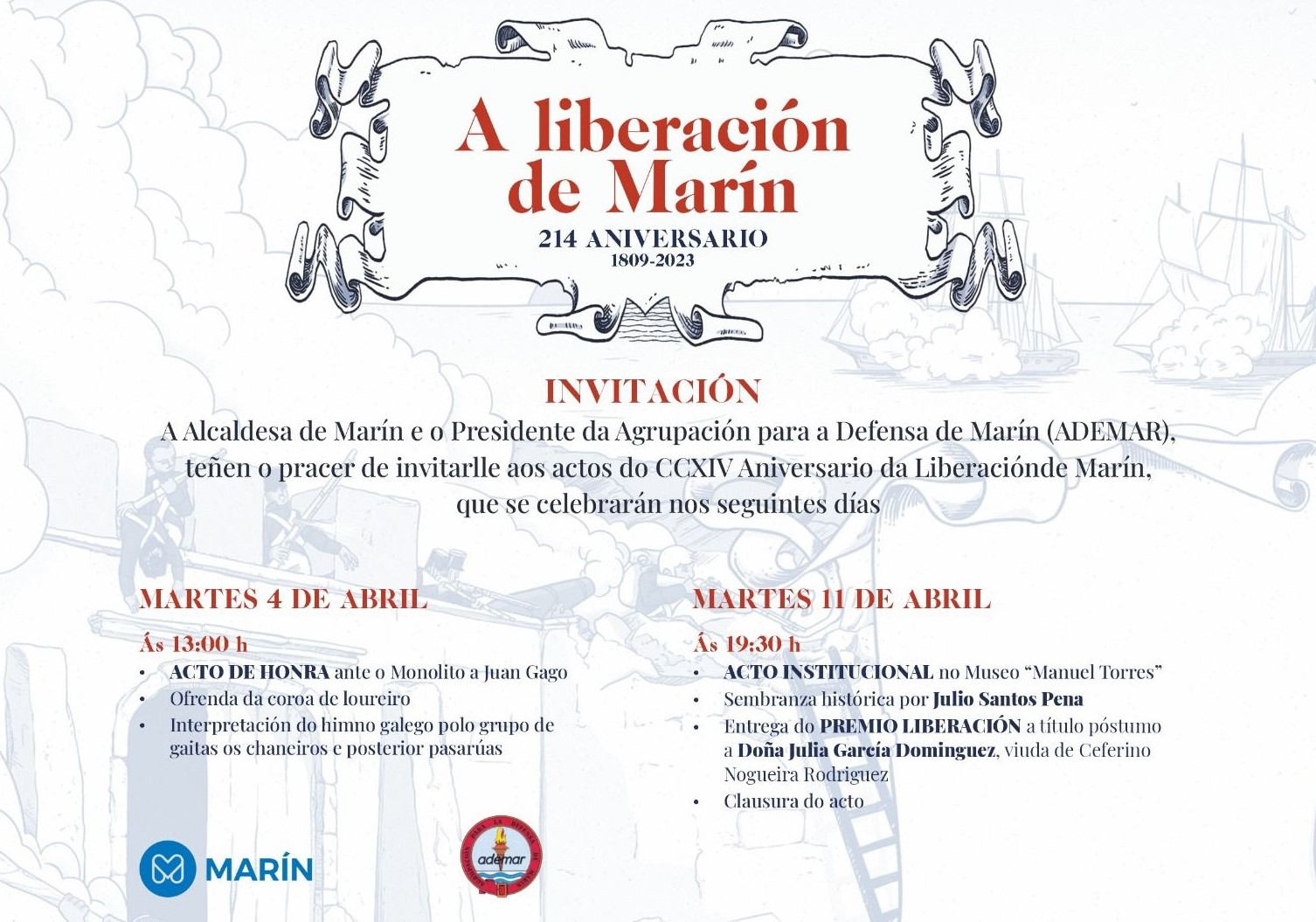 Esta tarde, a las siete y media tendrá lugar el acto institucional de la conmemoración del Día de la Liberación de Marín gesta ocurrida el 4 de abril de 1809 cuando Juan Gago de Mendoza y sus Alarmas del Morrazo consiguieron expulsar a los soldados franceses que se habían hecho dueños del Fuerte de San Fernando en una batalla desigual en la que venció el arrojo de los paisanos que se defendieron con lo que a mano tenían contra las armas de fuego de los gabachos.