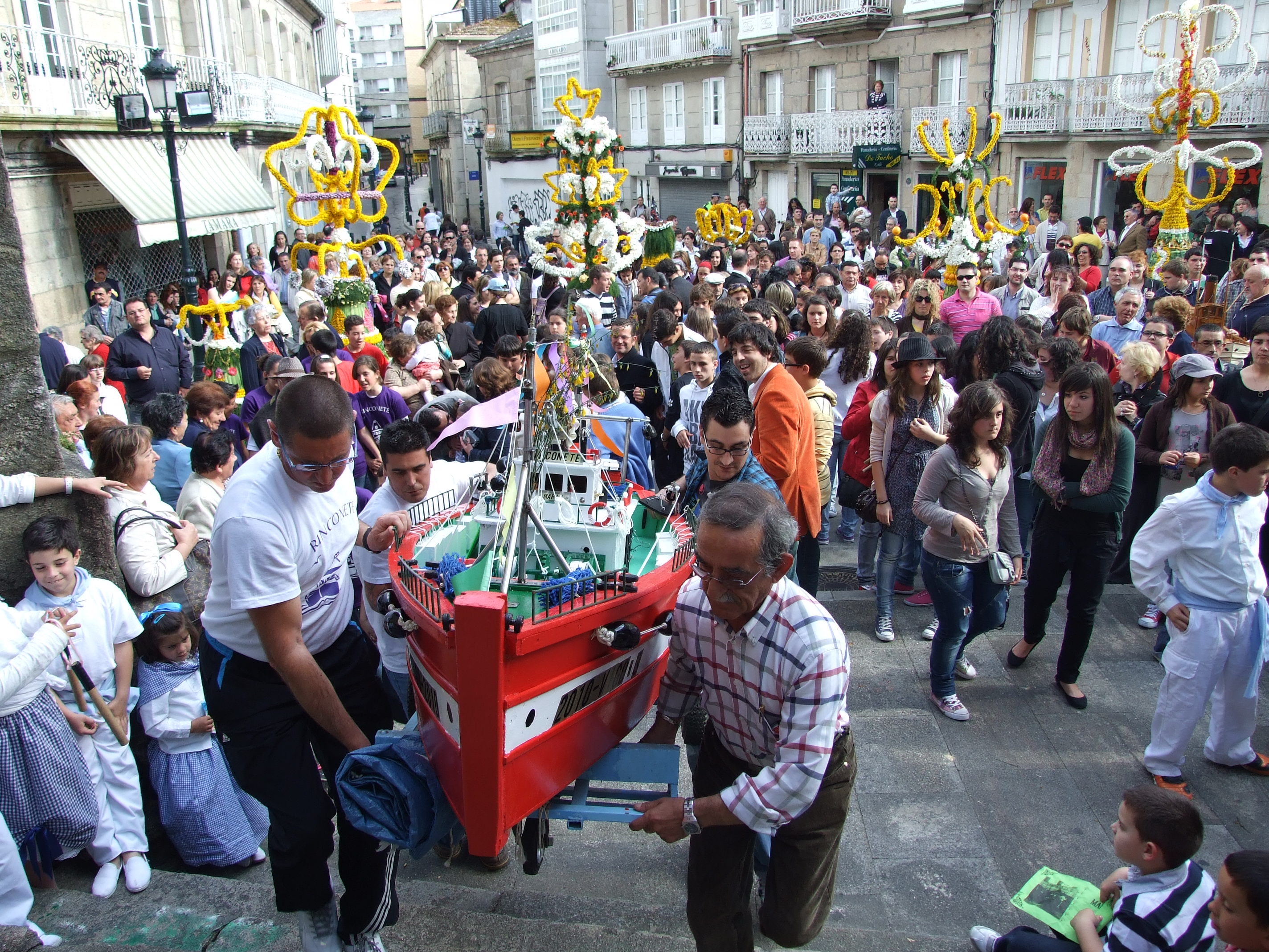 Convendría, na nosa opinión, que se evitase o amontonamento dos maios e barcos que, en anos anteriores colocáronse todos xuntos durante a mañán pegados ao palco da música. Alguen da organización debería indicarlles a medida que van chegando a alameda que se colocasen relativamente distanciados a o longo dos paseos para así dar maior vistosidade á festa e facilitar que os grupos canten sin asoballarse uns a outros.