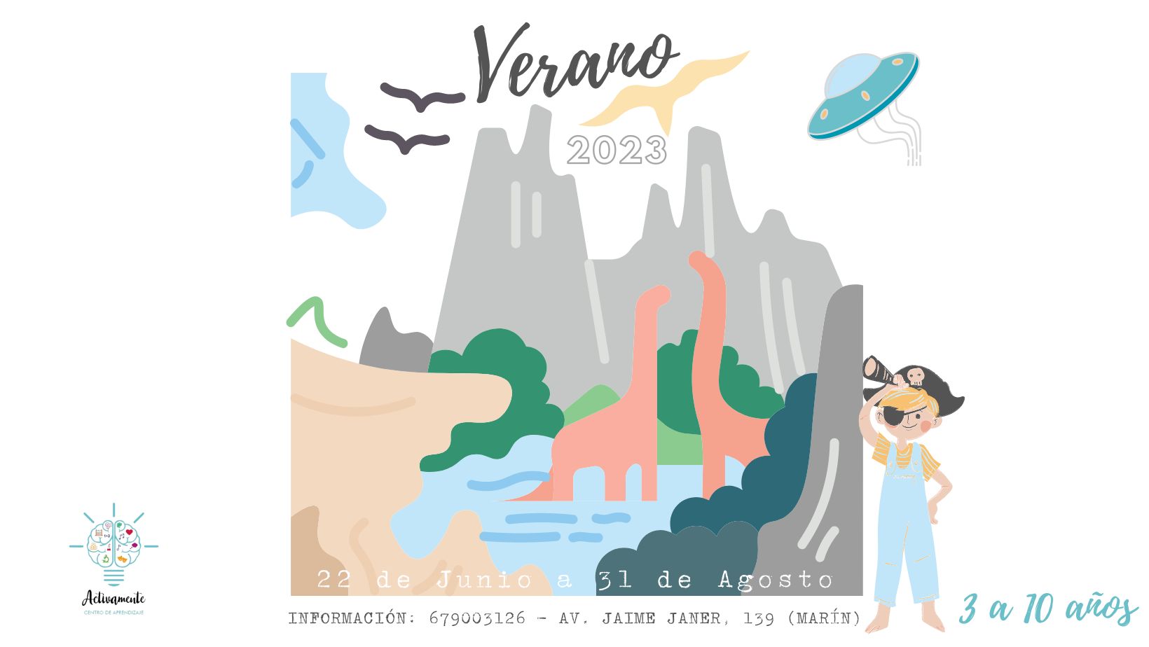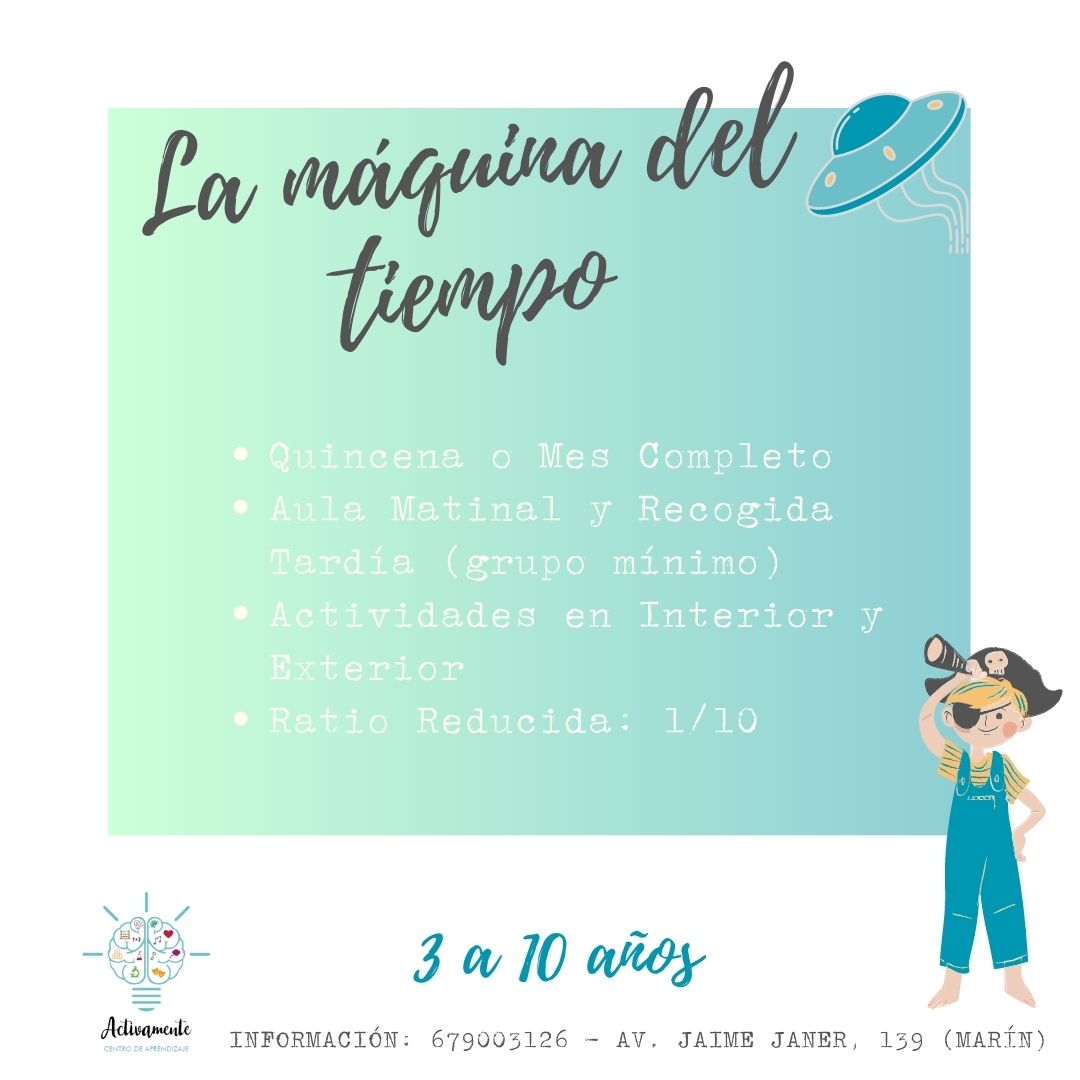 “Este verano - nos indican desde el propio centro - Activamente se convertirá en "La Máquina del Tiempo" pues, a lo largo de 11 semanas, descubriremos los hitos más importantes de la historia explorando el pasado y descubriendo el futuro a través de divertidas propuestas. En nuestra aventura, conoceremos a los primeros habitantes de la Tierra; los dinosaurios. Descubriremos la Prehistoria, nos embarcaremos con Cristóbal Colón en el descubrimiento de América o viajaremos al futuro”.