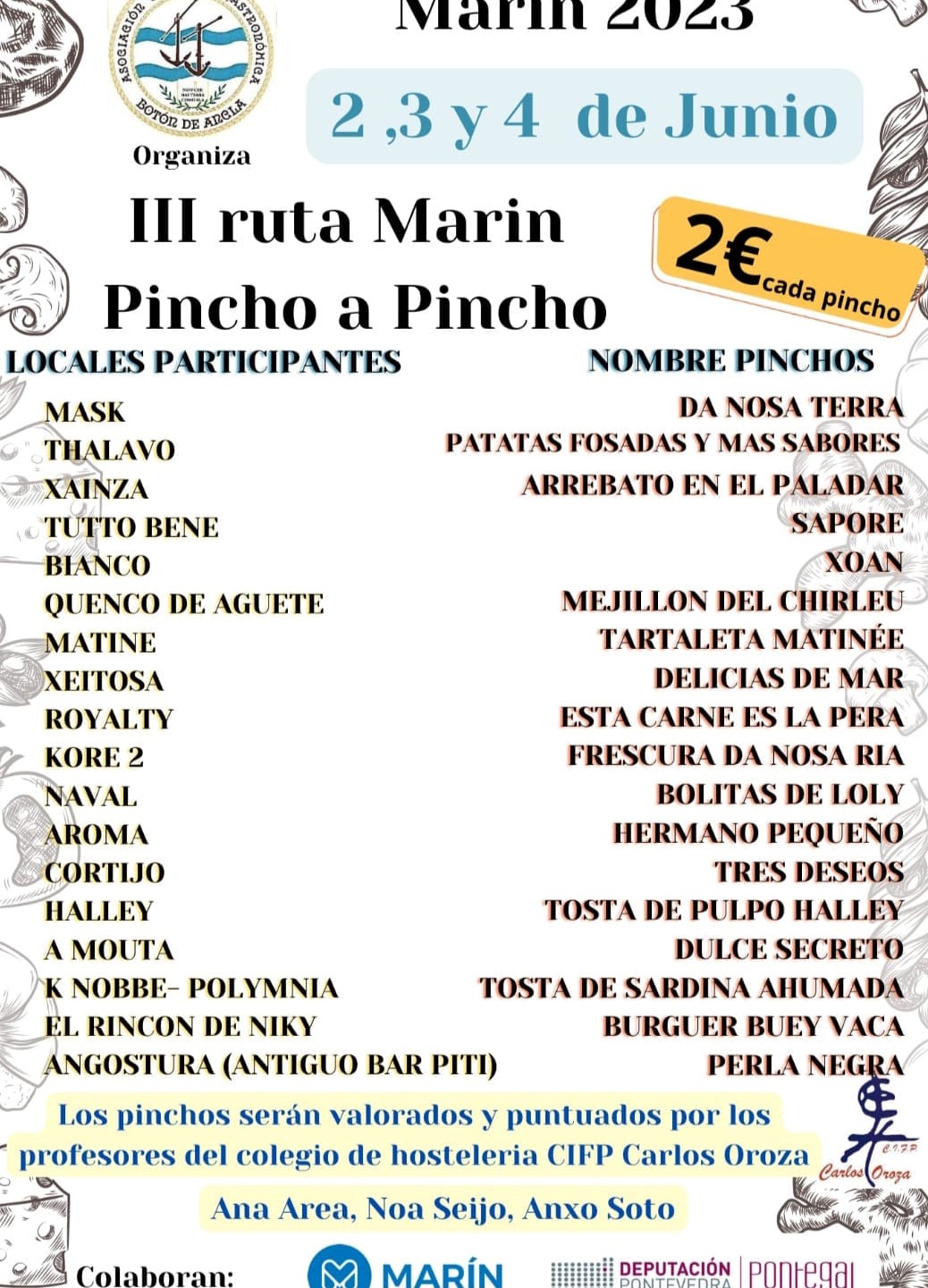 En esta tercera edición de la Ruta 'Marín, Pincho a Pincho' participarán dieciocho establecimientos hosteleros de Marín, capital, y Seixo, que presentarán a concurso y a la degustación de sus clientes sus pinchos representativos que se pondrán degustar los tres días del evento de 12 a 15 horas y de 19,30 a 22 y media de la tarde-noche, al precio de 2 euros la unidad. Los pinchos de todos los locales serán evaluados por un jurado compuesto por profesores de la Escuela de Hostelería Carlos Oroza, que serán los encargados de decidir quiénes serán los merecedores de los tres premios, consistentes en unos viajes, y trofeos para los mejores en cuanto a proporcionalidad, originalidad, calidad, presentación y sabor.