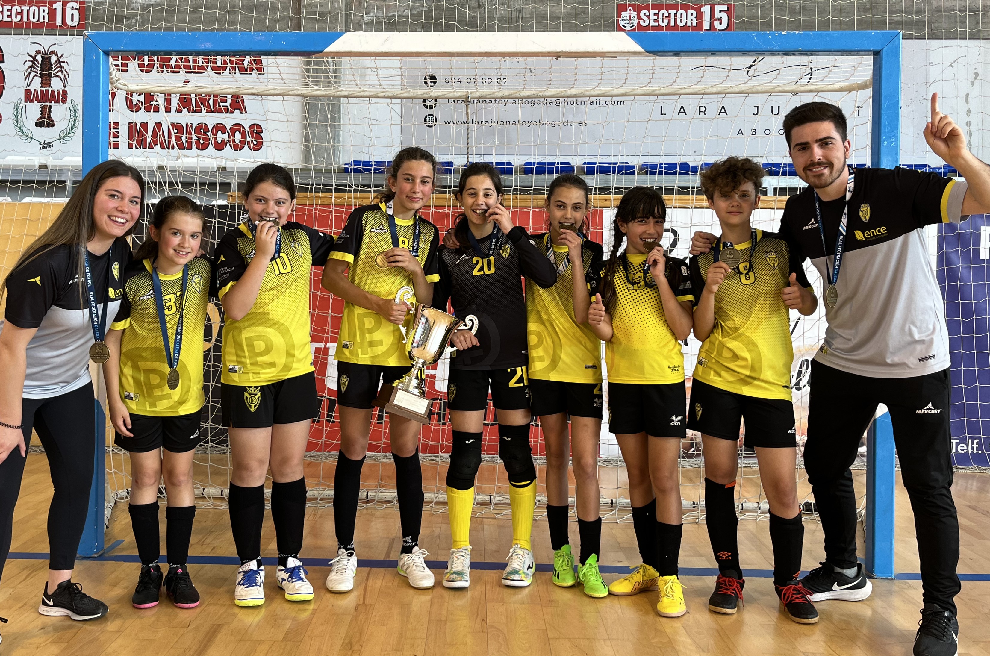 El pasado miércoles 17 de mayo, tuvo lugar la final del playoff de la Liga Gallega Alevín Femenina de fútbol sala en el Pabellón Municipal Agustín Mourís de Noia, enfrentando al Club Deportivo La Peña y al S.D.C.R. Narón O Freixo. Tras imponerse por un 0-4, las marinenses se proclamaron campeonas de Galicia y certicaron su billete para el Campeonato de España, con sede todavía por determinar.