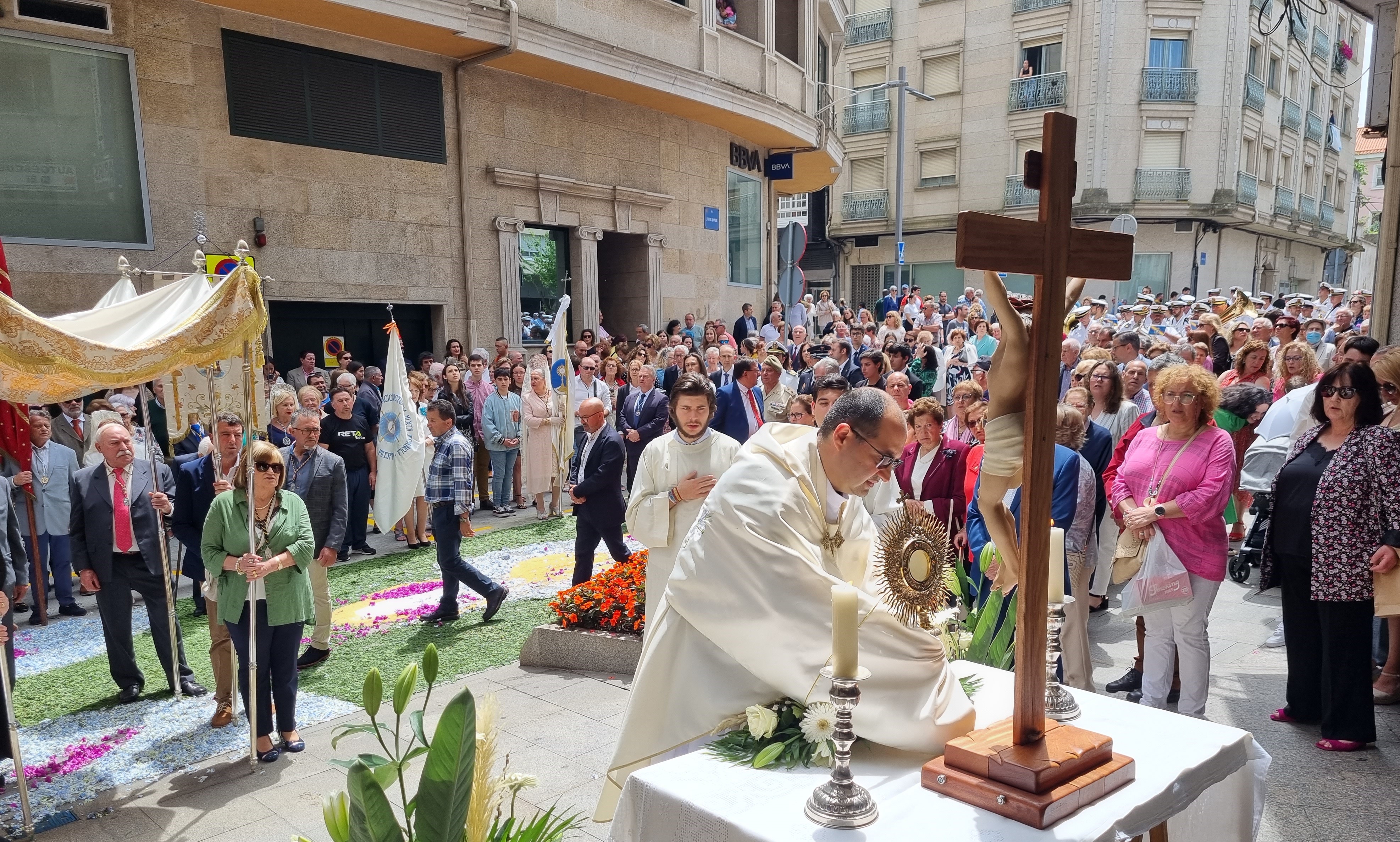 La principal parada se efectuó pocos metros antes de finalizar el recorrido en plena Plaza del Reloj donde se dispuso el último de los altares desde el que el párroco portador del Monumento, realizó la última de las bendiciones ante los asistentes que se encontraban sobre una de las magníficas alfombras.
