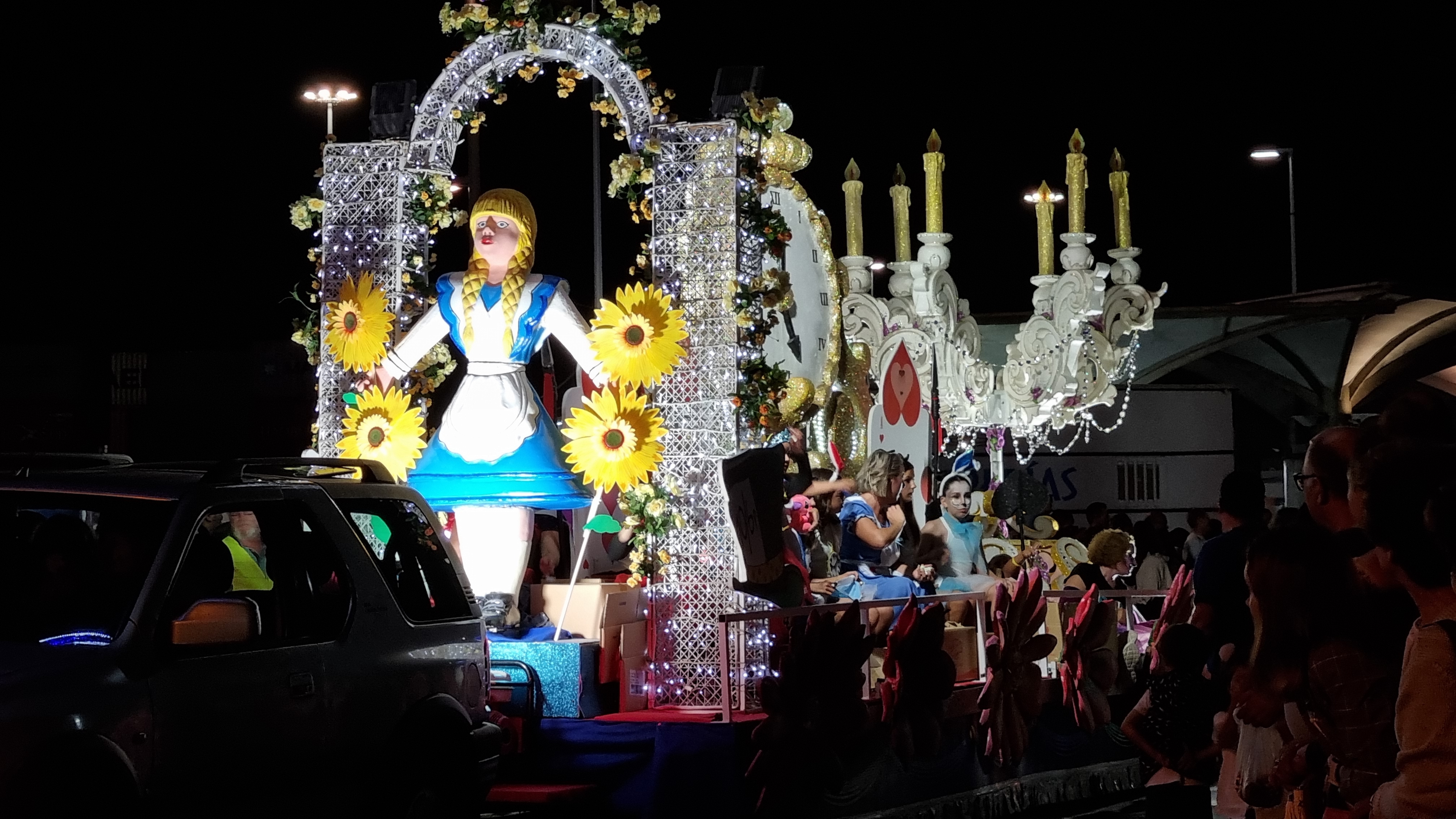 por cierto un nombre inapropiado porque ni lleva una sola flor ni se lanza un solo pétalo y debería llamarse batalla de caramelos porque, al margen de la vistosidad de las carrozas que formaban parte de la comitiva, hubo cientos de kilos de caramelos por el aire lanzados desde los distintos motivos rodantes que componían la “batalla” y los niños y niñas, pero también muchos mayores, recogían con verdadera fruición aunque el dispositivo de seguridad formado por números voluntarios, ataviados o no con los motivos de cada carroza, trataban y lo consiguieron, impedir peligros que se viven en este tipo de comitivas sobre todo cuando hay caramelos que caen a la carretera por donde circulan los vehículos engalanados.