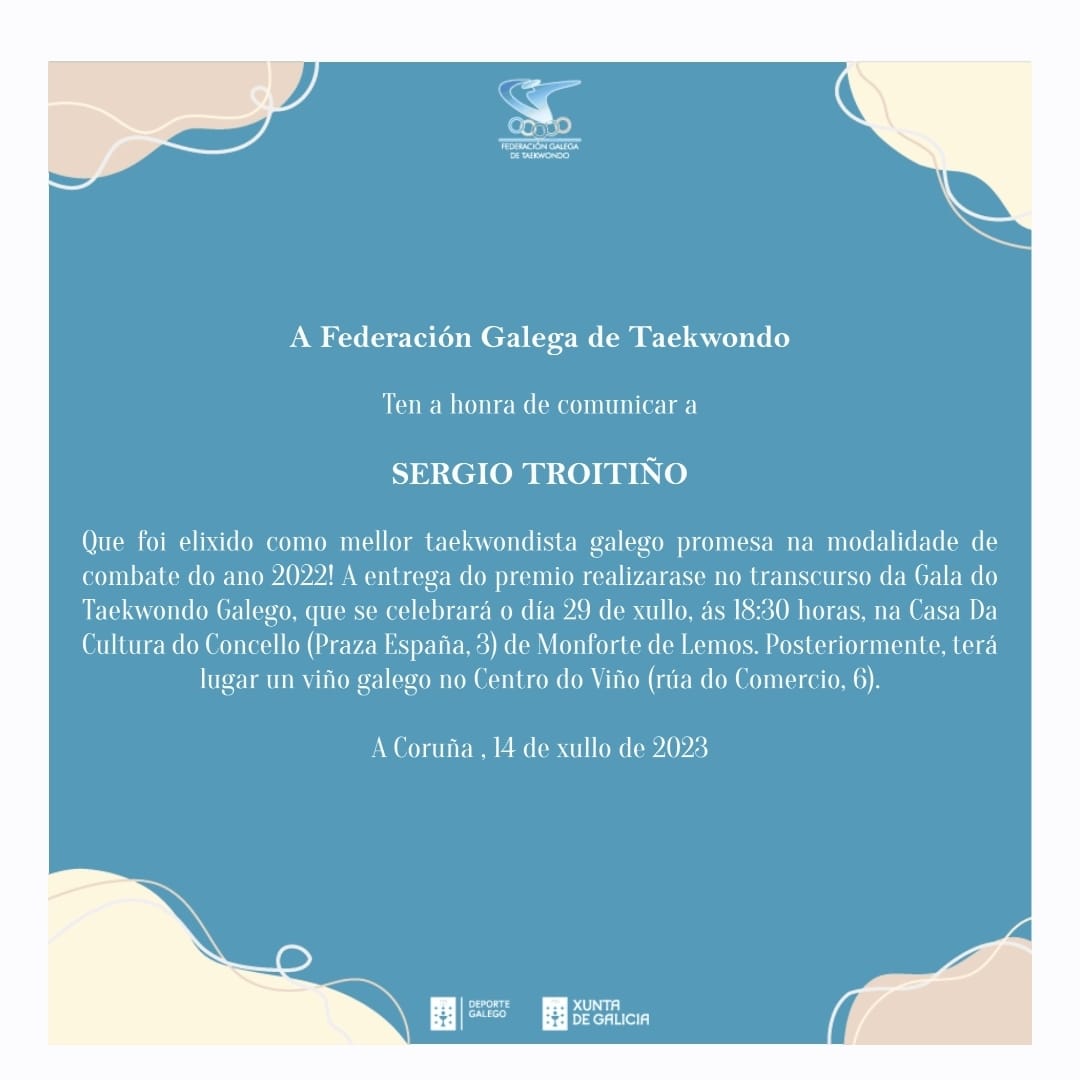 Y no es esa sola la buena noticia que tenemos que referir con respecto a Troitiño Amoedo ya que también hemos sabido que le han comunicado que le ha sido concedido el título de “Mejor Deportista Promesa en Combate” del pasado año 2022, gala que se ha de celebrar el próximo dia 29 en Monforte de Lemos.