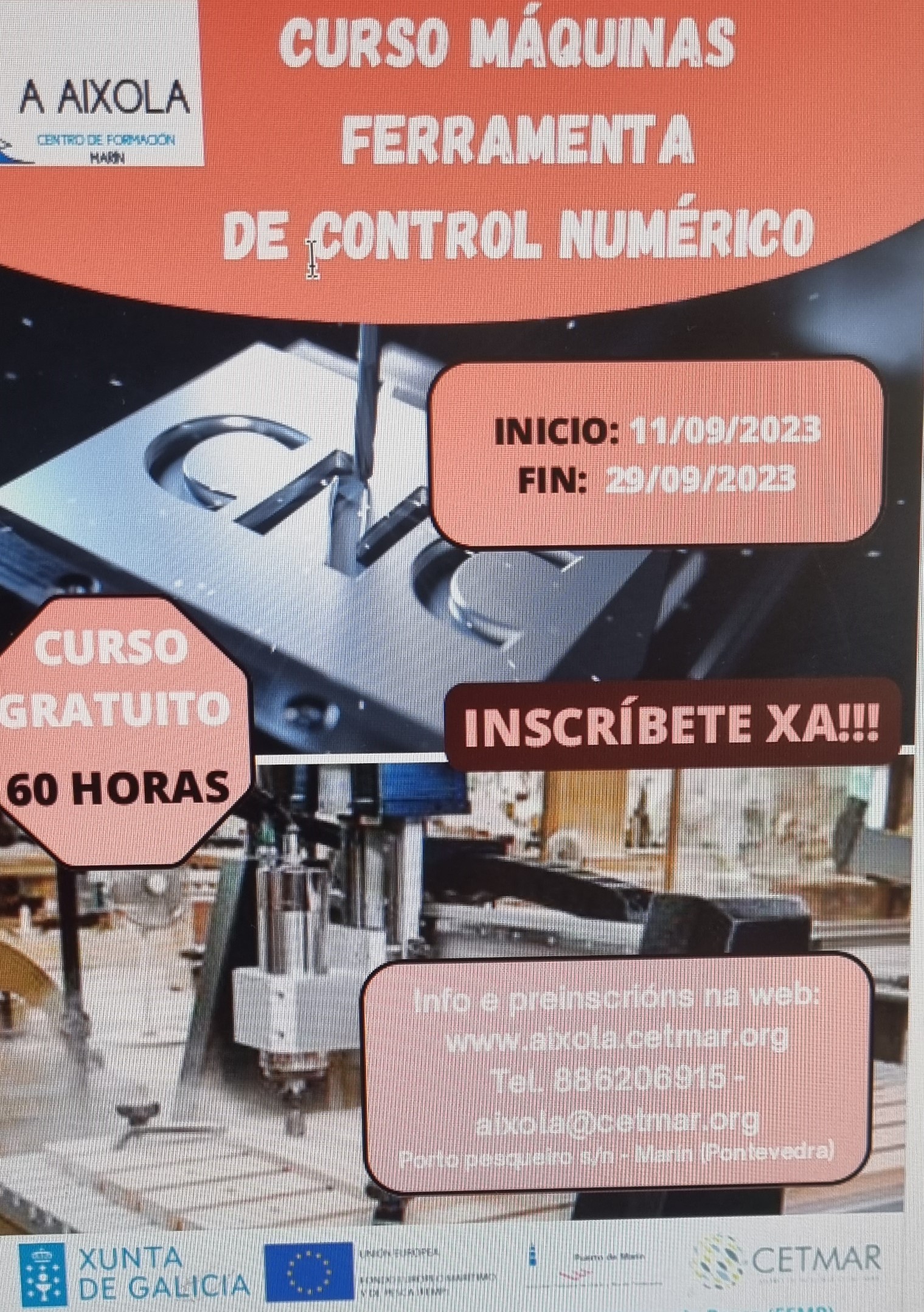 “Os nosos próximos cursos para o mes de setembro son: "Máquina de ferramenta de control numérico (CNC)" e "Prevención de riscos no sector pesqueiro" que desenvolveremos no Centro de Formación Aixola (en Marín, Pontevedra).
