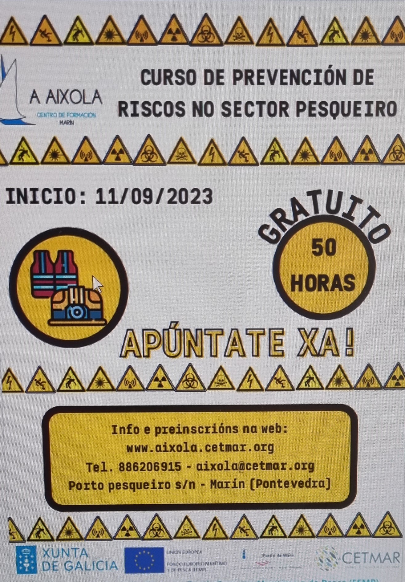 O Centro de Formación “A Aixola”. que funciona no interior do Porto de Marín anúnciase o próximo comenzo de varios cursos financiados polo Fondo Europeo Marítimo e de Pesca e pola Consellería do mar.