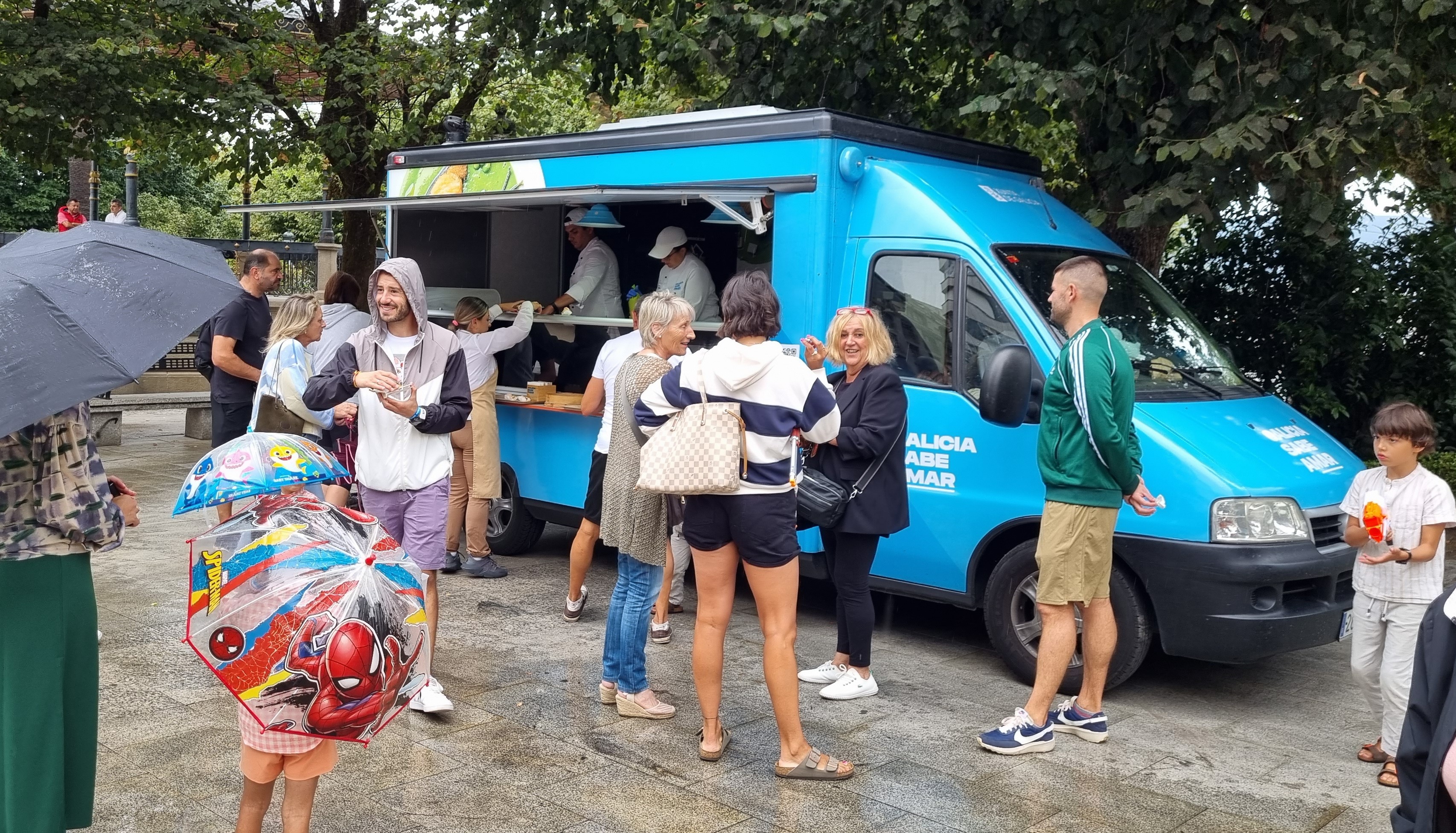 Hubo invitación, por parte de los componentes del grupo, a las clásicas tapas de las tabernas a quienes por allí andaban y, por su fuera poco, coincidió la fiesta con la presencia de la furgoneta con con los “petiscos” de productos de nuestros mares gallegos que aportó la Xunta de en la campaña que recorre toda la Galicia para mostrar lo que se puede hacer y bien con los productos de nuestra costa,