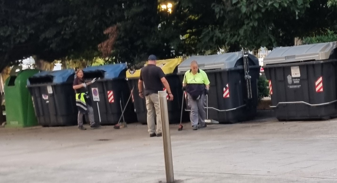 Ocho de la tarde de ayer. Queda una mesa libre en una terraza y aprovechamos para tomar un agüita fresca después de hacer una caminata. Una tarde agradable y por encima música en el palco por un trío que animaba el cotarro. De repente vemos cruzar a un joven, parece un camarero de algún bar cercano que llega con una bolsa, supuestamente con basura a los contenedores y, ¡oh sorpresa!, ni siquiera intenta levantar la tapa, ni con la mano ni con el pie, y las deposita al lado, en el suelo. El joven vuelve sobre sus pasos y se cruza con otra persona, una joven, también de otro bar con camiseta de uniforme. Esta lleva unas cajas de cartón y, al llegar a los contenedores, en lugar de aplastarlas y meterlas por la rendija, también las deposita fuera. ¡Que espectáculo!, comentamos.