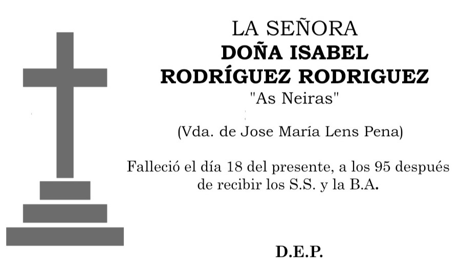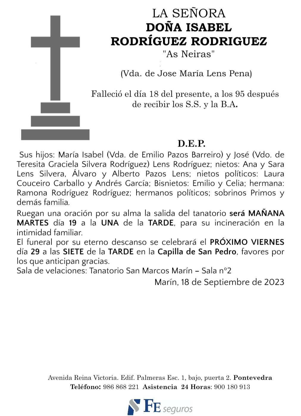 La Fe , funeraria, comunica el fallecimiento de Isabel Rodríguez Rodríguez a los 95 años de edad cuyo cadáver se vela en la sala número 2 del Tanatorio San Marcos, de Marín desde donde mañana martes, día 19, a la una de la tarde, será trasladado para su incineración quedando pendiente hasta el viernes a las siete de la tarde en la Capilla de San Pedro la celebración de la Misa por su alma.D.E.P.