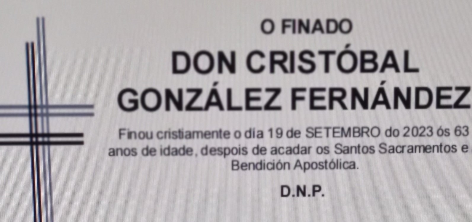 La Funeraria Albia comunica que en la sala número 3 de su Tanatorio en Marín se velan los restos mortales de Cristóbal González Fernández, fallecido hoy cuando contaba con 63 años de edad. Mañana miércoles día 20 a las 211,15 de la mañana saldrán hacia su incineración en la intimidad familiar y, por la tarde, a las 18,30 en el Nuevo Templo, se oficiará la Misa por su alma. Descanse en paz.