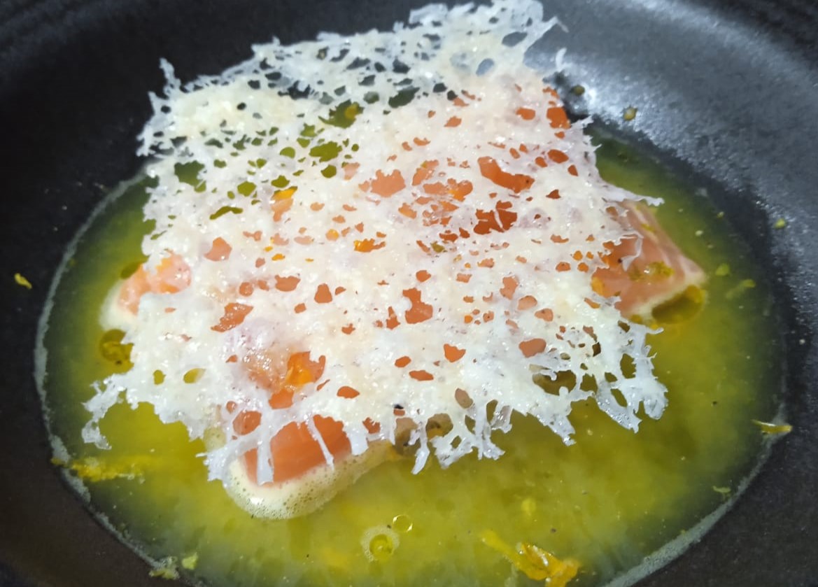 ¨* Salmón marinado con crujiente sobre vodka y naranja.