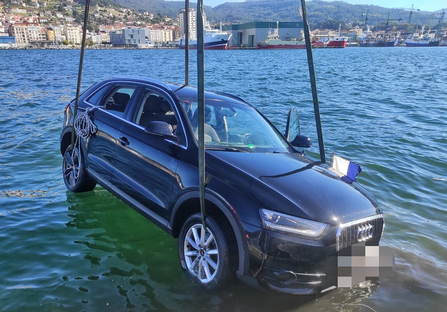 A media tarde de hoy se procedió al rescate del coche Audi que en la mañana de hoy se hundió en el mar en la dársena del Puerto de Marín tras deslizarse sin ninguna persona en su interior por el muelle acabado por caer al agua donde tras unos momentos de flotar parcialmente acabó hundiéndose.