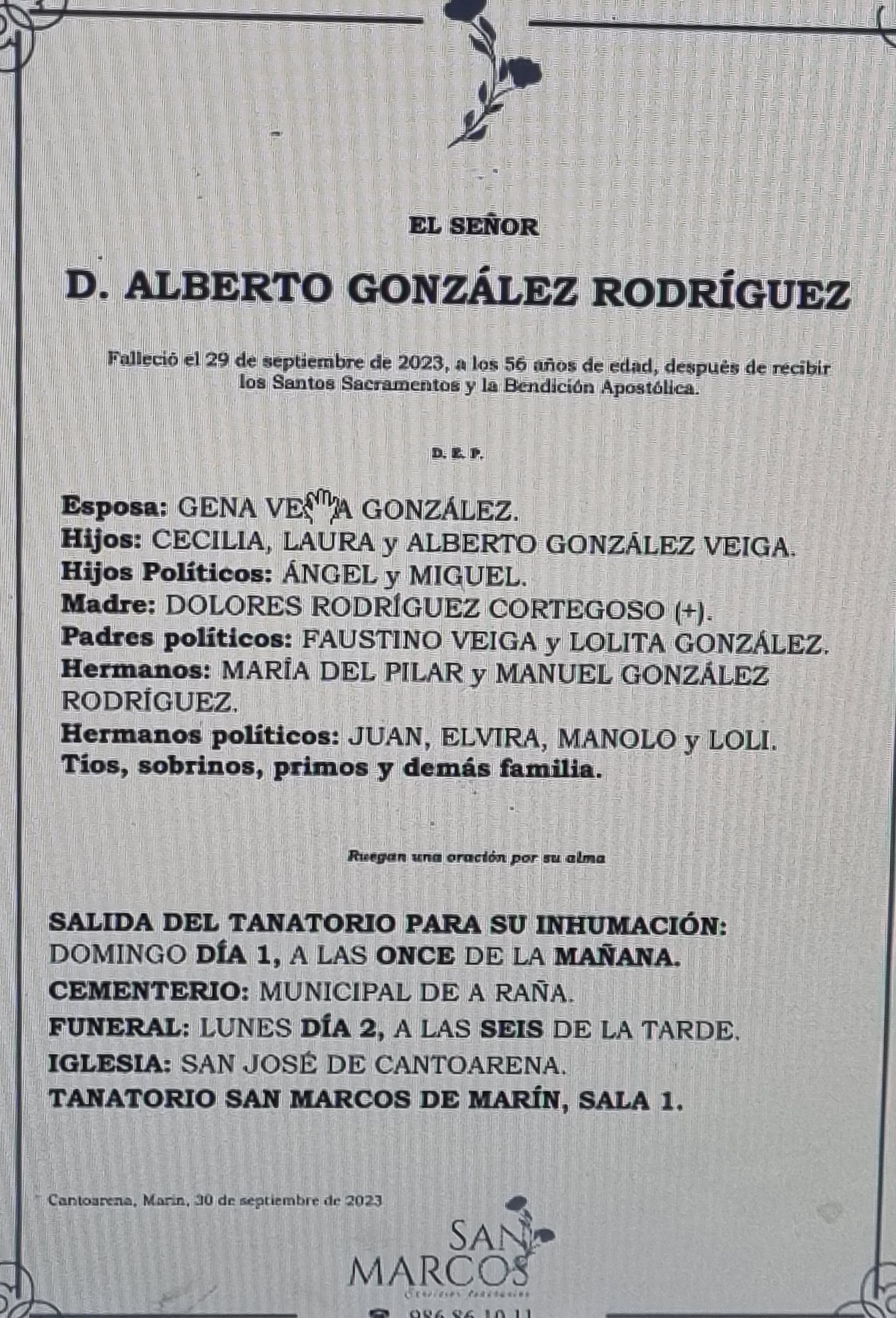 El Tanatorio San Marcos de Marín acoge los restos mortales de Alberto González Rodríguez, fallecido hoy a los 56 años de edad hasta el momento de su traslado al cementerio municipal de A Raña que se efectuará mañana domingo día 1 a las once de la mañana. D.E.P.