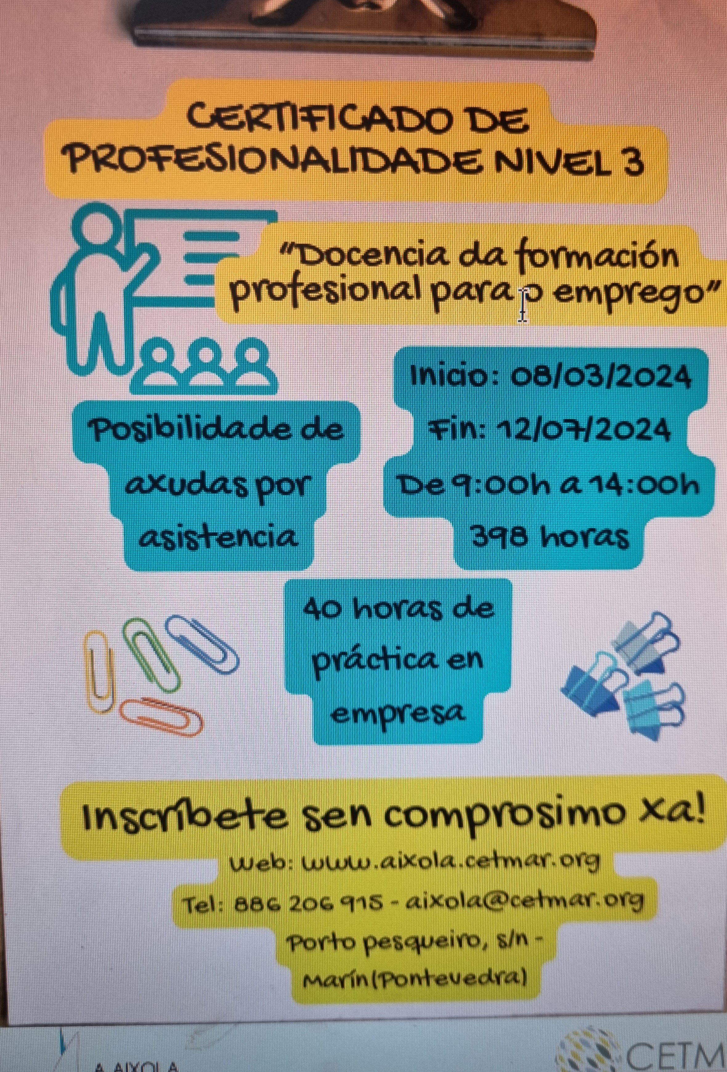 - CURSO DE DOCENCIA DA FORMACIÓN PROFESIONAL PARA O EMPREGO Nivel 3 (Necesario título bachiller ou equivalente)