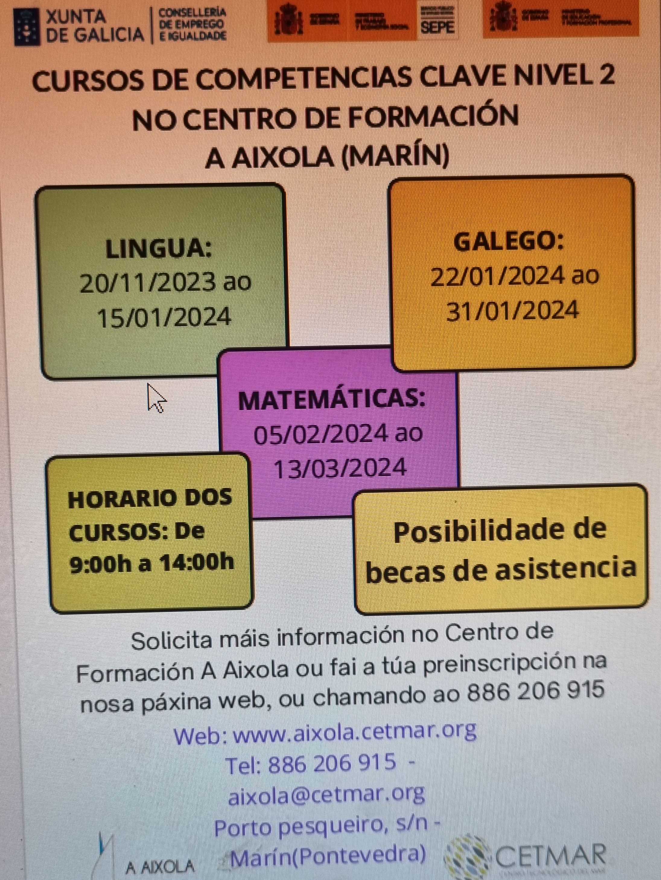 O Centro de Formación “A Aixola” ubicado no interior do Porto de Marín convoca unha serie denovos cursos próximos a iniciar nas súas instlacións dirixidos prioritariamente a persoas en situación de desemprego peroecesariamente