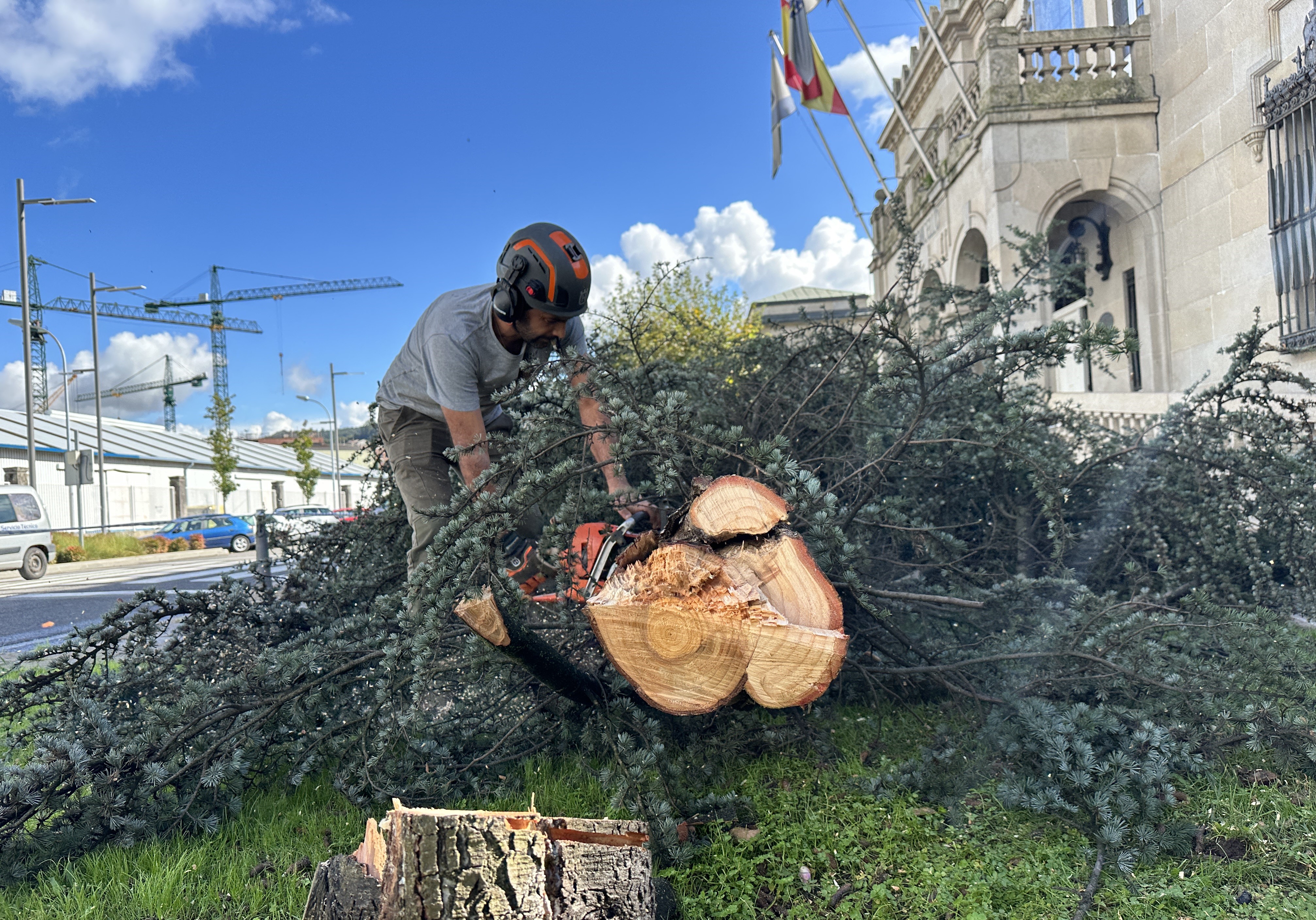 La concejala de parques y jardines, Cristina Acuña informó ayer sobre la necesidad de proceder a la tala de un árbol cedro ubicado en la entrada misma del edificio consistorial asegurando sentir “unha pena enorme”, pero justificando la decisión porque - asegura - “o estado da árbore, que estaba afectado no seu tronco, impedía calquera outra solución e supoña un importante perigo para a seguridade de viandantes e de coche”.