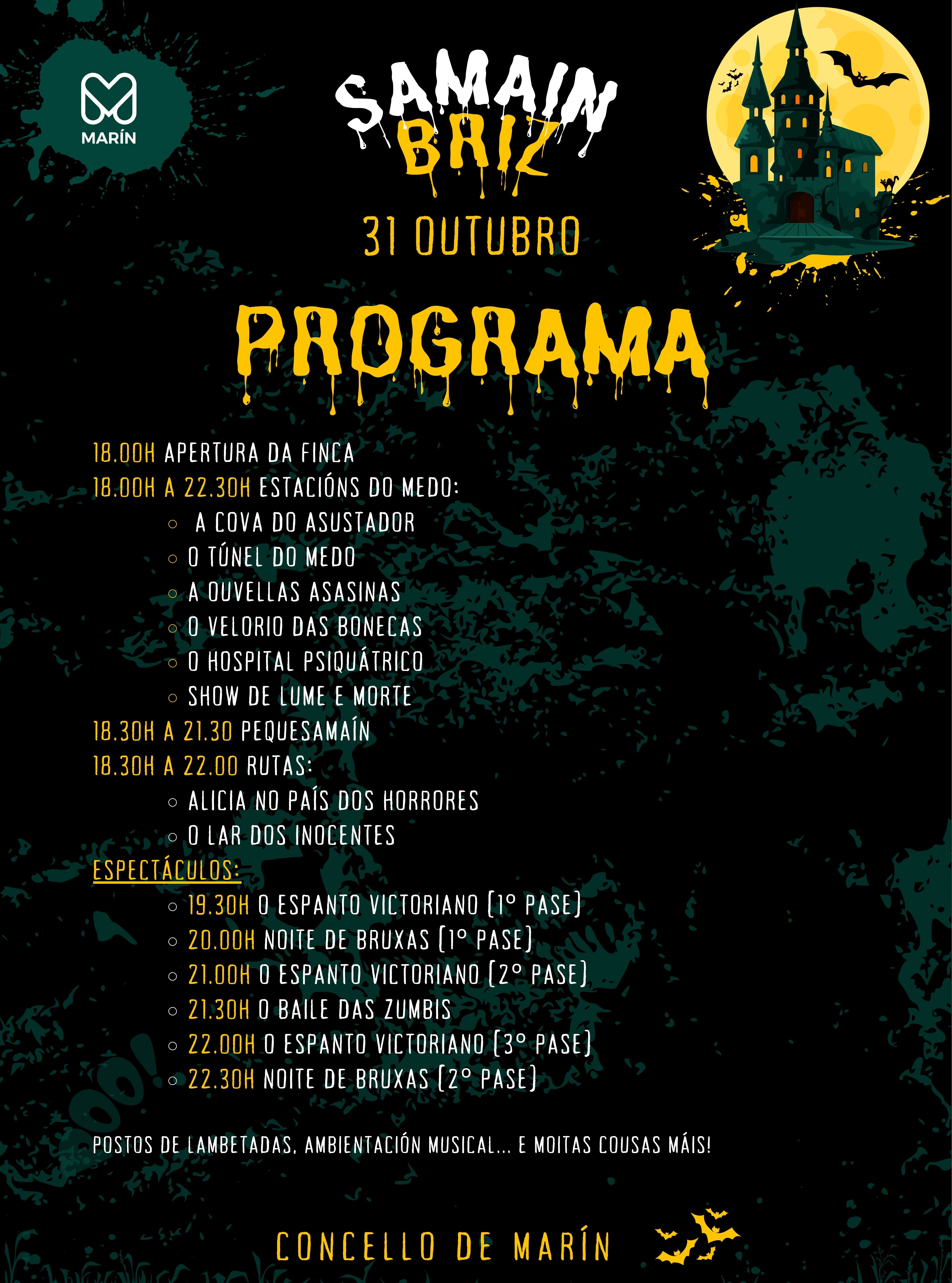 Un espacio, “PequeSamaín”, especial para niños y niñas mejores de diez años, las estaciones del miedo a lo largo de la finca y diversos espectáculos completarán las distintas rutas que se establecen en la finca, cargadas de “miedo” y diversión lo que hacen del parque de Briz un punto neurálgico del Samaín gallego no en vano se desplazan a Marín numerosas personas de todas partes estando previsto que, a poco que acompañe el tiempo climatológico, este año se superará la concentración ya muy intensa en las ediciones pasadas.