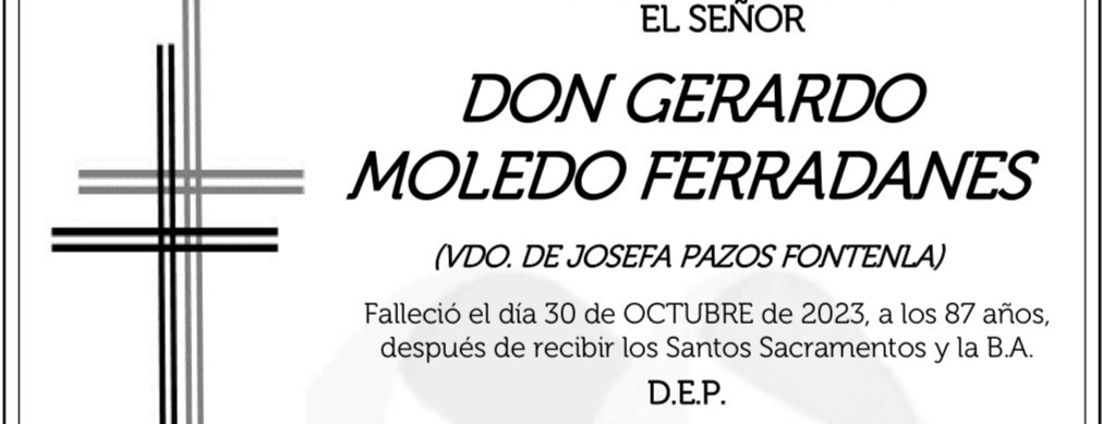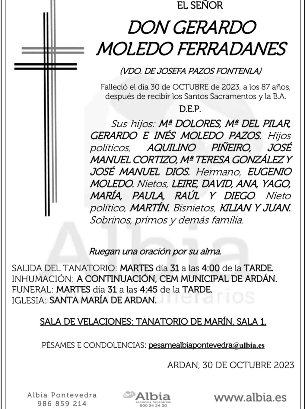 La Funeraria Albia comunica que en su tanatorio de Marín se velan los restos mortales de Gerardo Moledo Ferradanes, fallecido hoy lunes, día 30 de octubre a la edad de 87 años, hasta el momento de su traslado al cementerio de Ardán a las cuatro de la tarde de mañana MARTES, DÍA 31, para su inhumación con posterior celebración de la Misa Funeral en la iglesia de dicha parroquia. D.E.P.