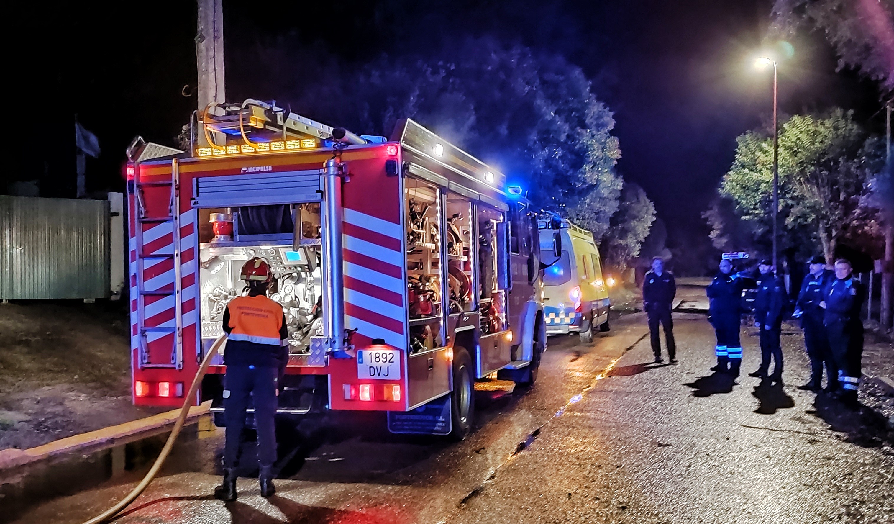 Policía Local de Marin, Policía Nacional, Bomberos de Pontevedra y Protección Civil de Pontevedra acudieron al auxilio de la persona afectada y al intento de extinguir el fuego que, al final, destruyó todo el habitáculo.