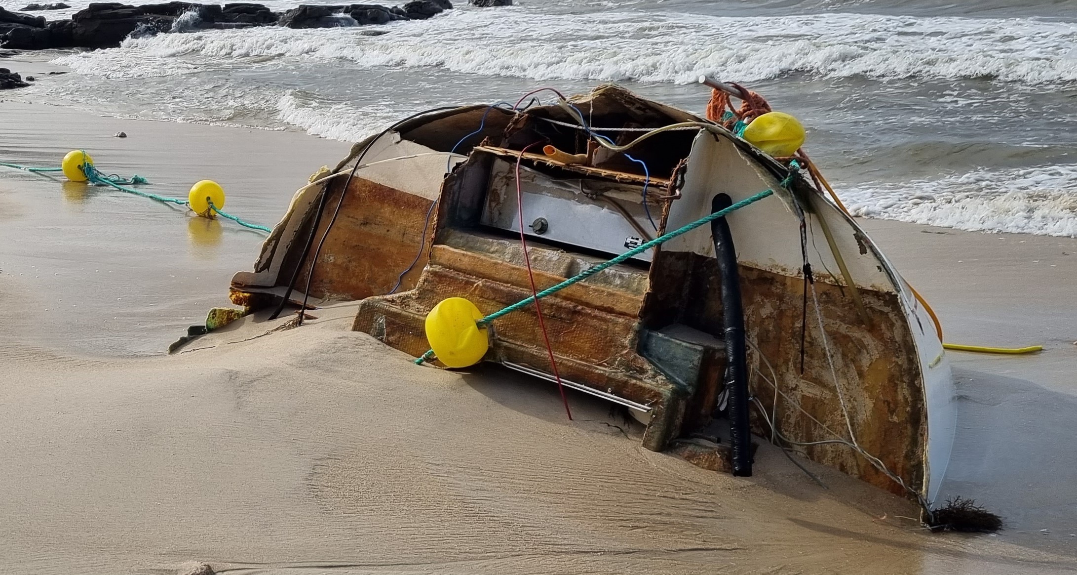 La playa de Aguete està sembrada de los trozos de un velero que esta noche se desprendió de sus amarres en el pseudopuerto deportivo acabando en el arenal donde las olas lo deshicieron totalmente esparciendo sus trozos hechos “cachitos” por toda la playa.