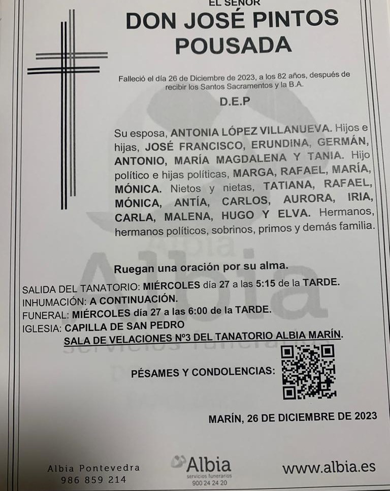 La Funeraria Albia comunica que, en la sala número 3 de su Tanatorio en Marín, se velan los restos mortales de José Pintos Pousada, fallecido hoy, día 26 de diciembre a la edad de 82 años, hasta el momento de su traslado que se efectuará a las cinco y cuarto de la tarde del Miércoles, día 27, para su inhumación. Asimismo comunca que el funeral por su eterno descanso se celebrará a continuación (6 de la tarde) en la Capilla de San Pedro. D.E P.