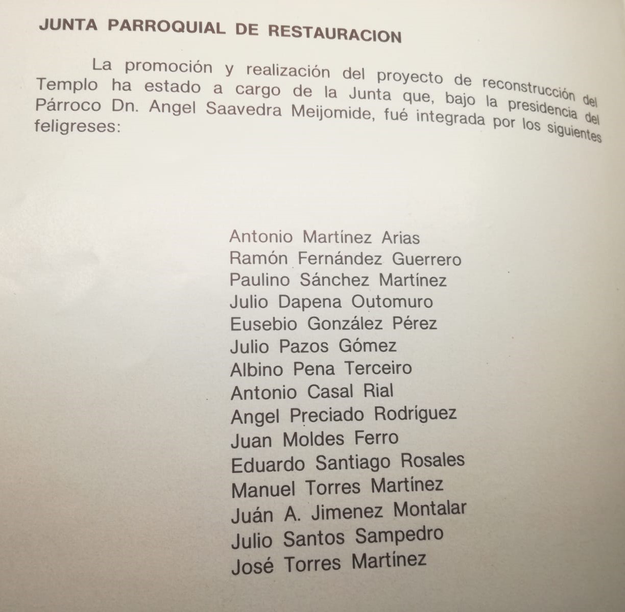 En el transcurso de la ceremonia celebrada en el Nuevo Templo, se dio a conocer la lista de miembros de la comisión denominada “Junta Parroquial de Restauración del Templo” así como las cuentas de ingresos, la mayoría por suscripción popular, y detalle de los gastos de las obras.