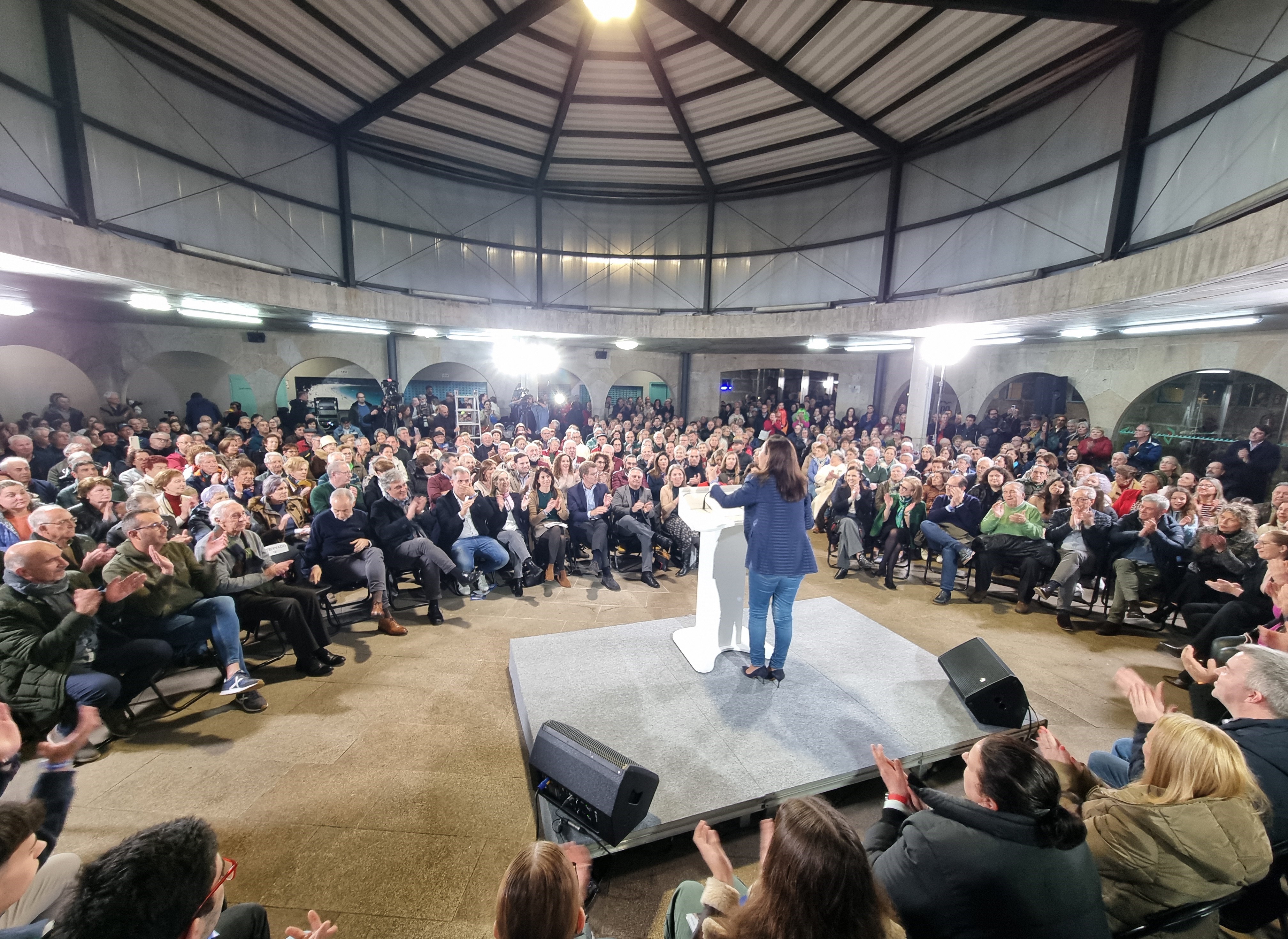 El multiusos fue totalmente insuficiente para acoger a tanto público mucho el cual tuvo que escuchar las intervenciones de pie aguantando la incomodidad. Tras el atril desde donde hablaron la alcaldesa, la candidata número cuatro por Pontevedra y el propio Feijóo, se dispusieron sillas en dos alturas desde donde escucharon a los ponentes medio centenar de jóvenes del partido y en el patio de sillas, junto a simpatizantes del PP dispuestos al aplauso y a repetir los gritos de “¡Presidente!, ¡Presidente!, se encontraban miembros relevantes del partido entre los que estaba el candidato Manuel Santos Costa que no llegó a intervenir debido a su situación de lógico bajón moral ya que pocas horas antes fue inhumado su padre, Manuel Santos Juncal, fallecido el sábado y por lo cual recibió las condolencias y muestras de cariño de sus compañeros y del mismo Núñez Feijóo.